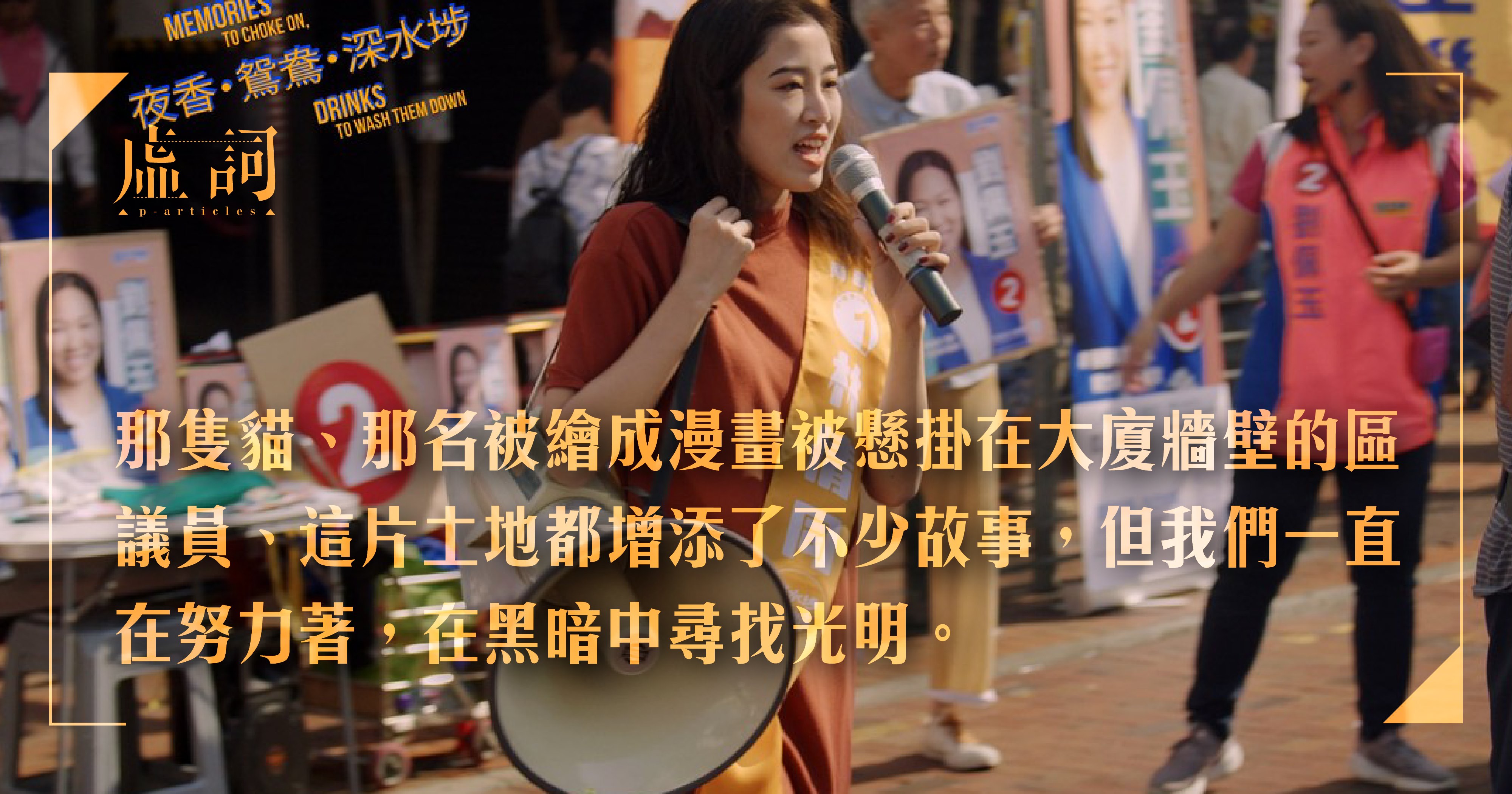 同樣,若要以定義「闊過西隧」的國安法「抽秤」仍在上映的《夜香.鴛鴦.深水埗》(高先電影,2020),那些標語、口號、旗幟、燈光、人鏈,甚或人群,想必也會「中槍」。這部由梁銘佳、Kate Reilly 聯合執導、監製、編劇、剪接的電影已獲「香港電影評論學會」最佳編劇和推薦電影,英文譯名為“Memories to choke on, Drinks to wash them down”,意即令人難忘/窒息的回憶(呼應《夜香》)、沖去它們的飲料(呼應《鴛鴦》),也如Kate所指,“Drinks to wash them down”是寄望將不好的回憶沖去。中文戲名方面,梁導笑言「若斬開四部份感覺好似冇咁好」,而實質戲名之間是可以互用,「好似鴛鴦咁溝吓溝吓」。