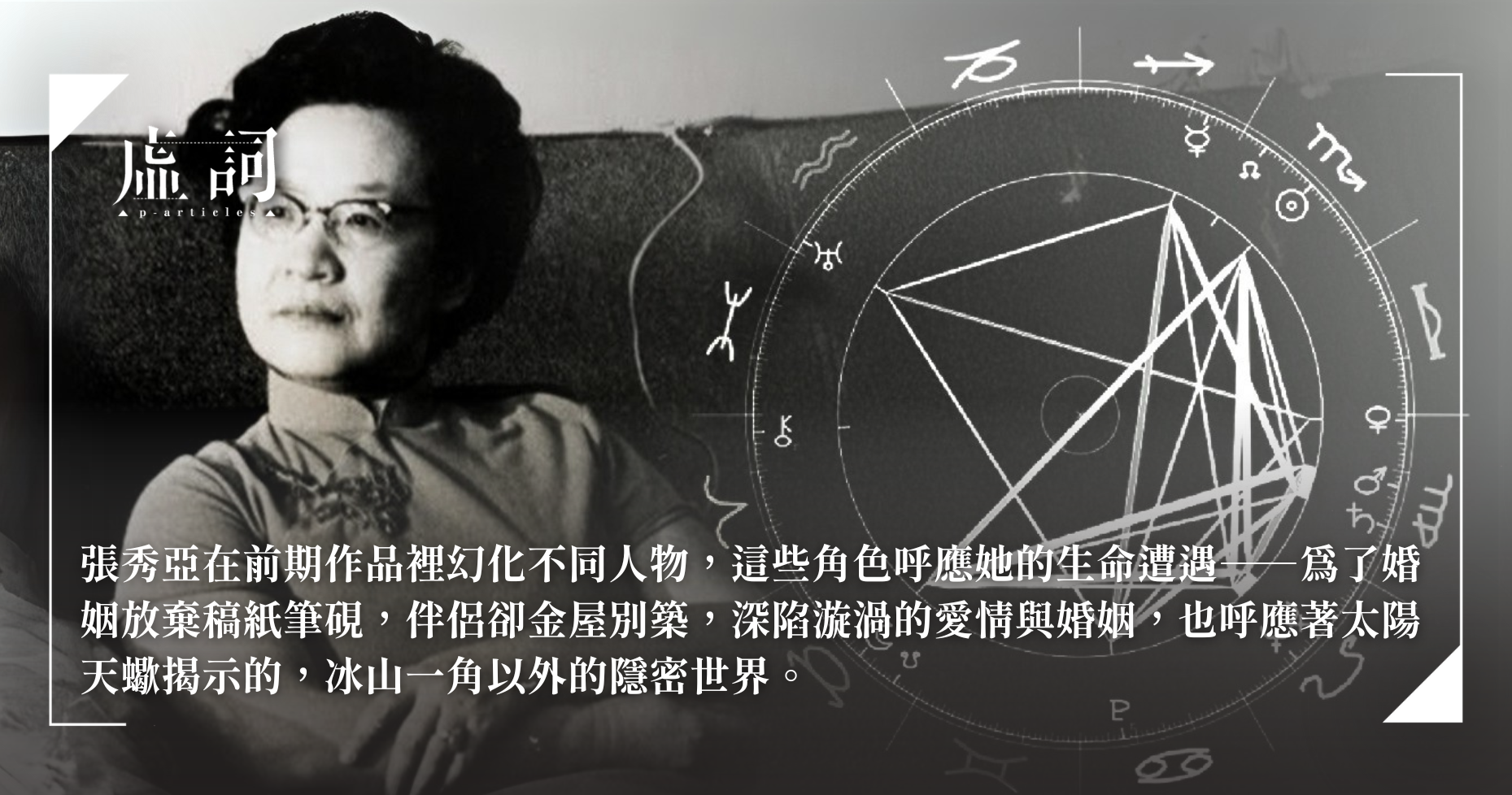擅長由景喻情,體物寫志的張秀亞,曾將自己比作扎了根的植物。有趣的是,她也覺得自己像個礦物:「默默無言的,在時間的積塵下長埋深藏。」不同於後來以花草水木描繪為主的文字——也是我們對張秀亞最深的印象,她在前期作品裡幻化不同人物,訴說著胸臆裡瀰漫纏繞的悲苦鬱恨,文字流露了真實無比的情感,反而予人深刻印象。這些角色呼應她的生命遭遇——為了婚姻放棄稿紙筆硯,伴侶卻金屋別築,深陷漩渦的愛情與婚姻,也呼應著太陽天蠍揭示的,冰山一角以外的隱密世界。「一個最愛以文字描述愛情的人,最與愛情無緣!」作品中背負幻想羽翼的婚戀關係,也是她不停拷問內心的主題。