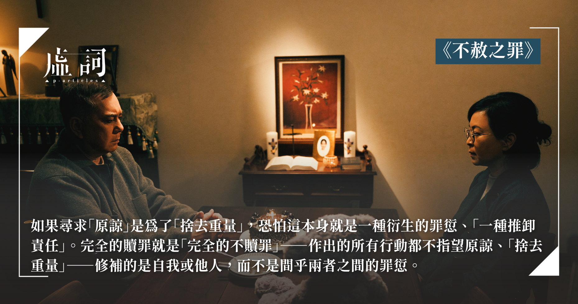 作為「無法赦免的罪」,無法也許不是指「沒有人有辦法赦免」,而是「沒有人有資格赦免」。他莫名奇妙地給恩晴發文字訊息,說請給我一次機會,梁師母(蘇玉華飾)回覆說,我不能回答你,恩晴已經不在了——事情就是這樣了。嘛,勉強要說的話,神有資格,神是一切的代理,同時也是沉默的代表,不到最後的審判沉默都不會被打破——似乎是這樣的吧?梁保羅自己也說,只有神能赦免,人是不可以的。