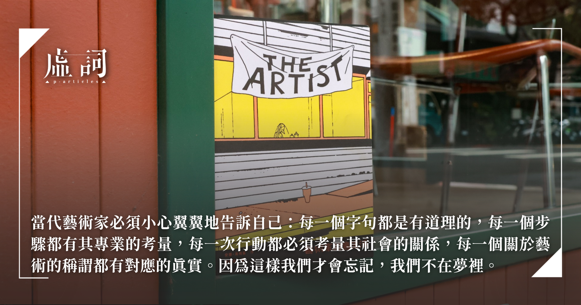 在這樣嚴峻的現實下,藝術家們因為無法參與那個其實不存在的虛幻世界而感到失落,就像焦慮自己無法進入真實的世界,但其實我們只是無法進入一場夢。為了對抗這個焦慮,當代藝術家必須小心翼翼地告訴自己:每一個字句都是有道理的,每一個步驟都有其專業的考量,每一次行動都必須考量其社會的關係,每一個關於藝術的稱謂都有對應的真實。