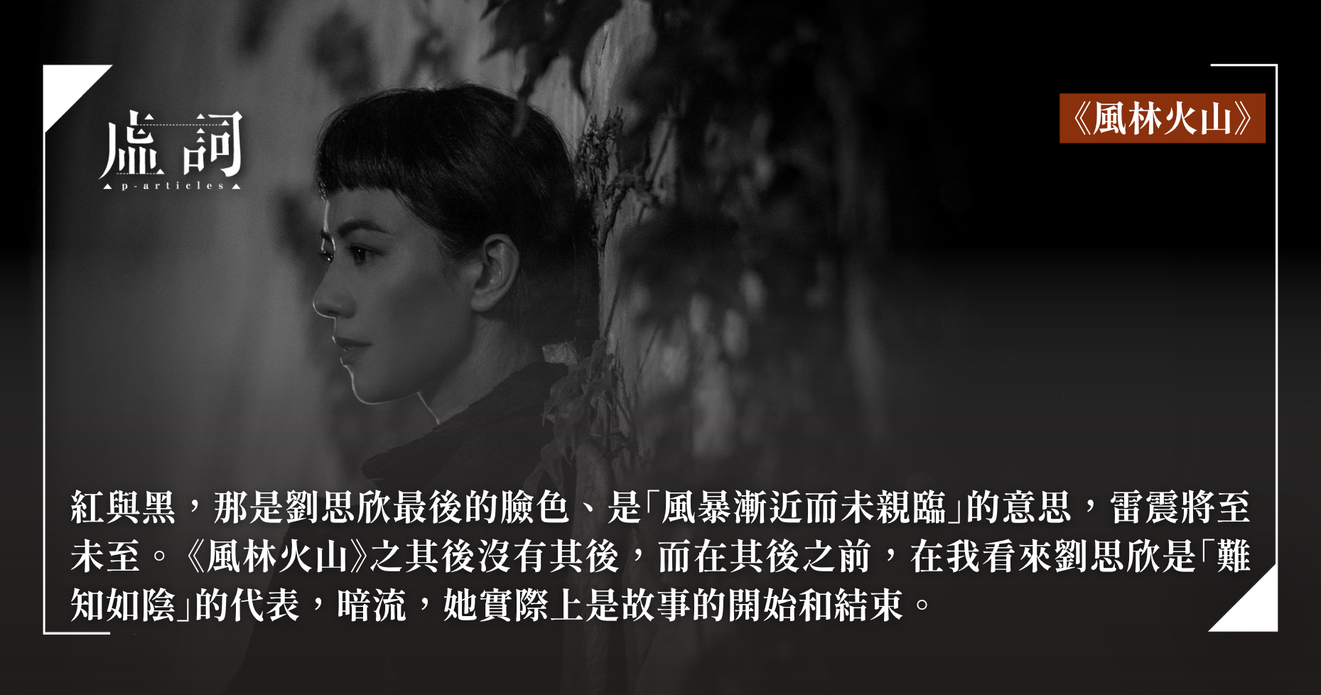 電影裡面的三股主要勢力都有這樣盡頭之後的存在,在「清潔工家族」是小葉(姜珮瑤飾),在警察一側是王志達6歲的女兒——或許還有「簡鳳全」那個(不存在的)兒子,和阿焦的兩個孩子;雖然前者已經辭去警務,不知道從屬於哪個勢力,反正就是好像沒有怎麼交代,但是電影既不厭其煩地重覆一次,在我看來並不會毫無理由;最後當然是在橋言的劉思欣和她的孩子——憂鬱的色階在電影的尾末被打破,麵店槍擊之後畫面完全染紅,紅與黑,那是劉思欣最後的臉色、是「風暴漸近而未親臨」的意思,雷震將至未至。《風林火山》之其後沒有其後,而在其後之前,在我看來劉思欣是「難知如陰」的代表,暗流,她實際上是故事的開始和結束——李珀山的死亡到對於「下一代」的等候——雖然是少數「能夠在黑幫電影中有能動性的女性」(李薇婷,註4),電影對她卻著墨不多,作為要角毋寧太少,就無法再往下推說;不過如果有其後的話、如果《風林火山》只是序章,那麼電影宣傳語「動如雷震」,便是如同「災難」一樣的從未發生、尚未交代,只以類似簡鳳全的兒子那樣的形式,存在於熔接拼合的裂縫裡面,指向夢雨之中掛有霓虹的酒家。