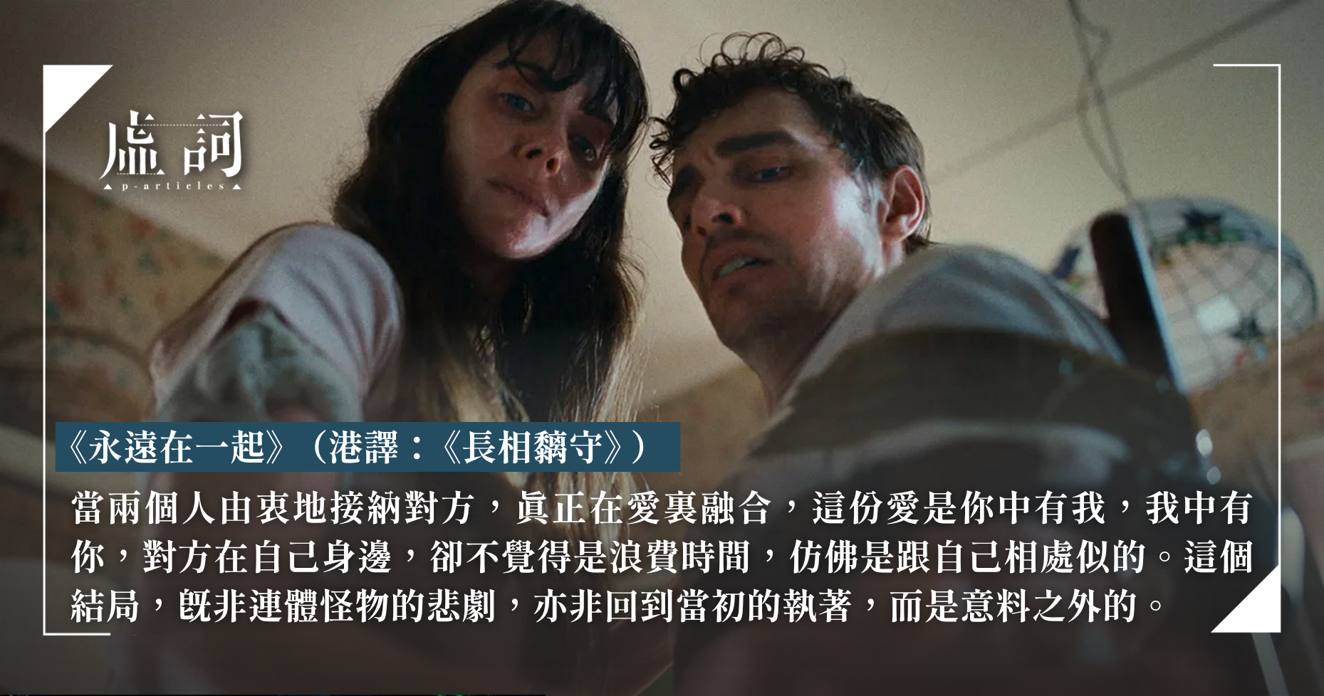 如果《完美物質》的肉體恐怖是一分為二,那麼,《永遠在一起》就是合二為一。這兩種形式都服務於不同的主題——一分為二,圍繞自我的分裂,以及内在、外在的鬥爭;而合二為一,最適合去探討愛與接納。撇除肉體恐怖類型,《完美物質》的這種進路,與一般克隆人類型的題材也相近,倒是合二為一的肉體恐怖,卻有某種新穎之感。即使有些微缺失,但瑕不掩瑜,在角色設計、概念想法,以及肉體恐怖的表達上,《永遠在一起》注定不是一部簡單的肉體恐怖作品。