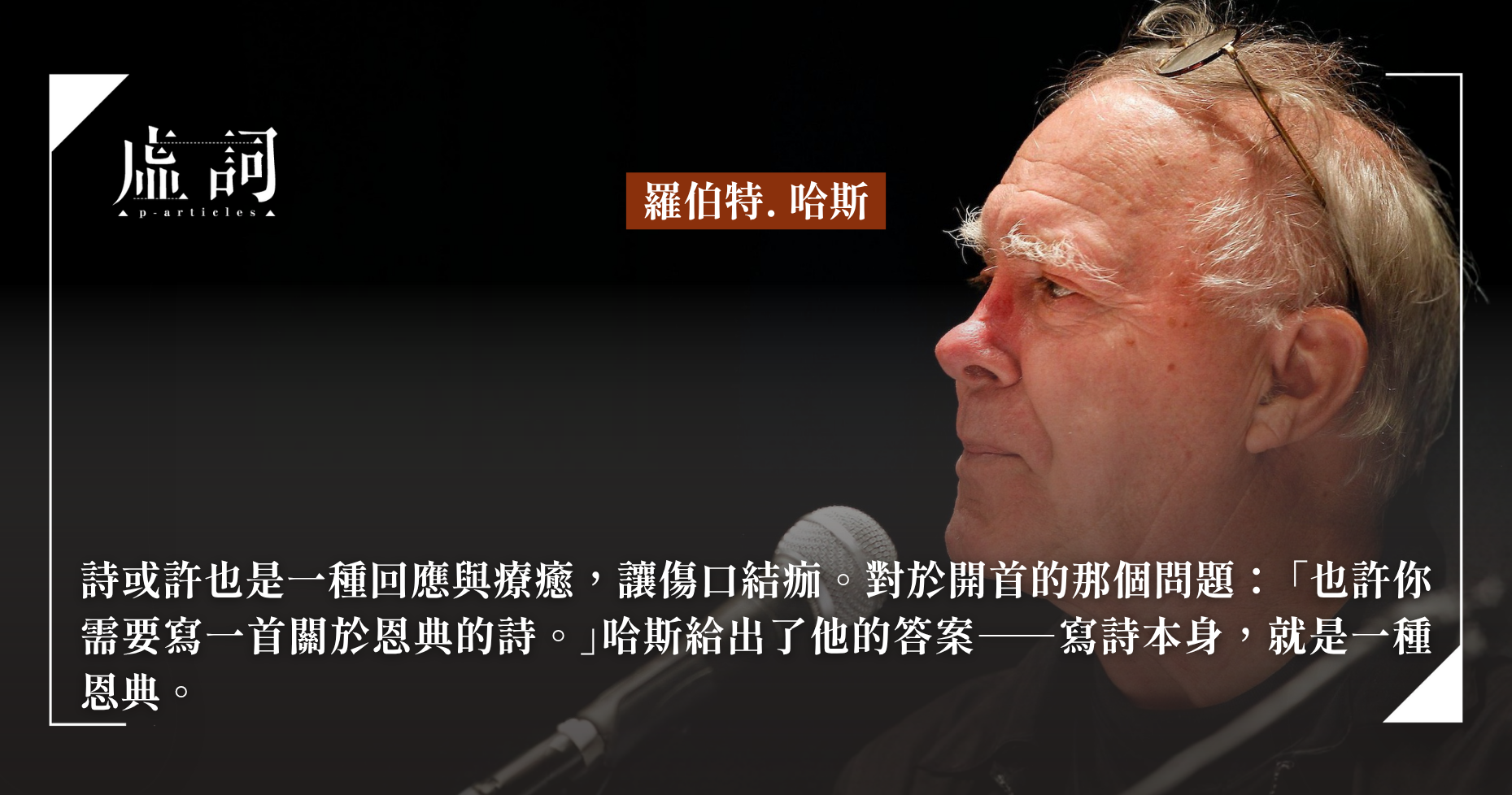 而「我於是想到:這世界如此多難/有時候必須引亢歌唱。」之句,也讓我聯想起亞里士多德之所謂文學的淨化 (catharsis),以藝術作為情感宣洩的途徑,撫平悲傷與恐懼。詩或許也是一種回應與療癒,讓傷口結痂。對於開首的那個問題:「也許你需要寫一首關於恩典的詩。」哈斯給出了他的答案——寫詩本身,就是一種恩典。