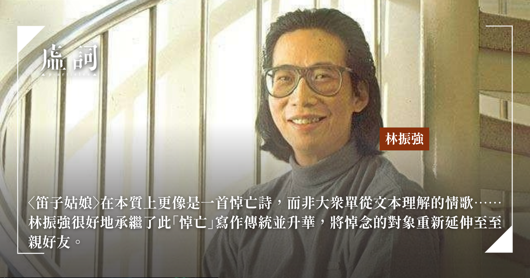 不少人以為〈笛子姑娘〉是大路情歌,這是從讀者﹙觀眾﹚的感受出發,從強伯和他的親人卻不然,寫作此詞之時林家幼妹林雁妮因病逝世,強伯正是在其病榻旁照顧送別,所以〈笛子姑娘〉在本質上更像是一首悼亡詩,而非大眾單從文本理解的情歌。而在古典中國文學,悼亡詩的寫作傳統源遠流長,可以追溯到《詩經》,但西晉潘岳﹙247-300﹚的五言古詩〈悼亡詩〉三首以後,基本上「悼亡詩」就專指丈夫追悼妻妾的詩作,如中晚唐元稹﹙779-831﹚之七言律詩〈遣悲懷‧其二〉就有名句「誠知此恨人人有,貧賤夫妻百事哀」、南宋陸游﹙1125-1200﹚追悼前妻唐宛的〈沈園二首〉亦有「傷心橋下春波綠,曾是驚鴻照影來」之語。北宋蘇軾﹙1037-1101﹚的〈江城子.乙卯正月二十日夜記夢〉「十年生死兩茫茫,不思量,自難忘。千里孤墳,無處話淒涼」更是宋詞中之悼亡代表作。筆者認為林振強很好地承繼了此「悼亡」寫作傳統並升華,將悼念的對象重新延伸至至親好友。值得一提,強伯同時也為棠哥寫了一首〈無知的她〉,在內容上巧妙和〈笛子姑娘〉作對照:
