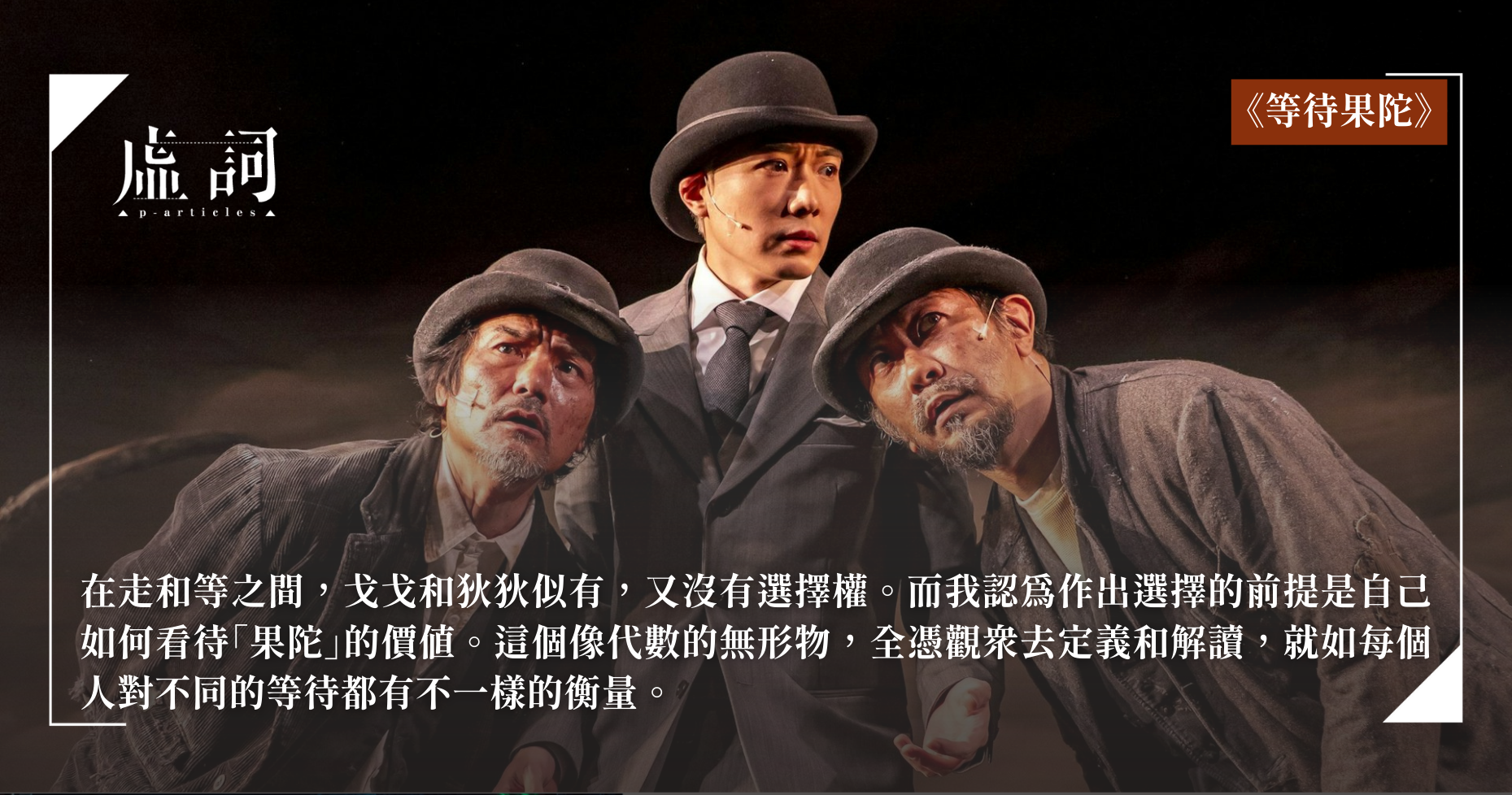 兩幕的結尾,戈戈和狄狄都口頭上達成共識說要離開,但兩人卻在閉幕下仍然留守原地,無動於衷,形成了盲目的定格。這帶動了觀眾去想:他們走,還是不走?走的意思是永遠不回來,還是明天再回來?接連又回歸思考最原始的問題:等,還是不等?在走和等之間,戈戈和狄狄似有,又沒有選擇權。而我認為作出選擇的前提是自己如何看待「果陀」的價值。這個像代數的無形物,全憑觀眾去定義和解讀,就如每個人對不同的等待都有不一樣的衡量。