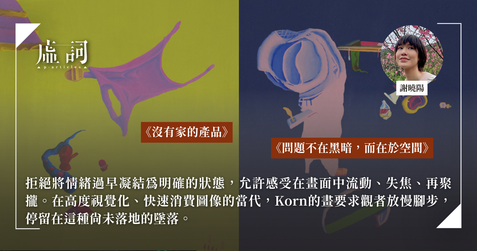 並非每個藝術家都熱衷於為作品命名,但Korn絕對是例外。他的作品標題本身即帶有詩意,如《問題不在黑暗,而在於空間》(It’s Not the Darkness but the Size of the Room)、《從此以後》( Hereafter )、《清閒的一刻》(A Moment of Leisure)、《告別知覺》(Bye to Perception)、《落在胸口的重量》(It Can Feel, on the Chest)、、《彷彿時間不夠……》(Like There Is Not Enough Time…),《醫院裡的時光》(A Time at the Hospital)等。他曾在社交媒體上坦承他的煩惱:「標題還在琢磨中,詞彙已經有了,只是還沒找到最精準的說法。」由此可見,一句精妙的短語,是他創作過程中不可或缺的一環。