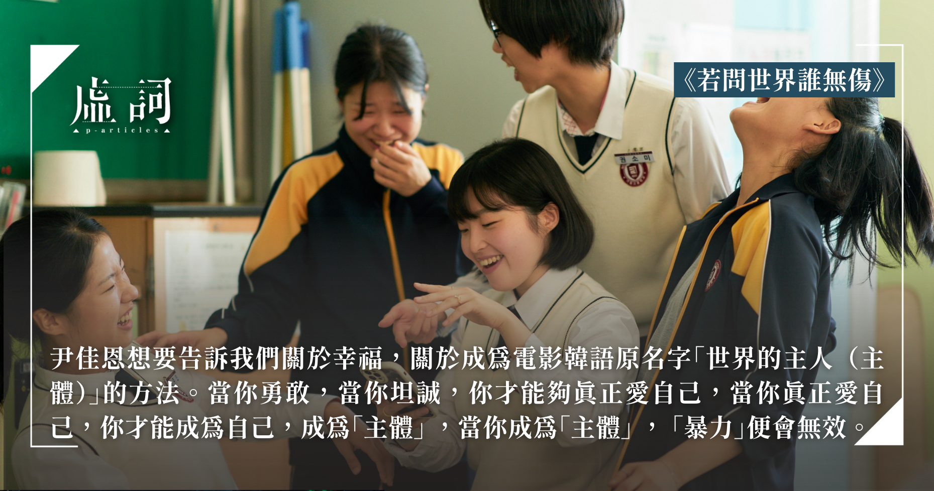 《若問世界誰無傷》大部份時間用長鏡頭展示,充滿生活細節的平常背後正正籠罩住「暴力」,具有傳染性的暴力,電影的前半段,觀眾們的疑惑都是來自於此,暴力就是「秘密」。「⋯⋯灰暗塗抹灰暗,生命的形體變逐漸老去。」,這些「暴力」的目標正是青春的生命。而一旦過去的「暴力」被聽見,一旦被「凝視」,每個人都會瞬間支離破碎,失去自己,變成「復數」(Hannah Arendt語),在電影中,主角主仁開始被無人知曉到底是誰的小紙條追問你是誰。原本熱情、活潑的她變得自疑、易怒、「暴力」傾向,與原來的朋友、生活產生裂縫,少女彷彿老了好幾歲。難道只有當我們落力表演快樂時,我們才是快樂嗎?主仁弟弟苦練的魔術最後還是失敗。