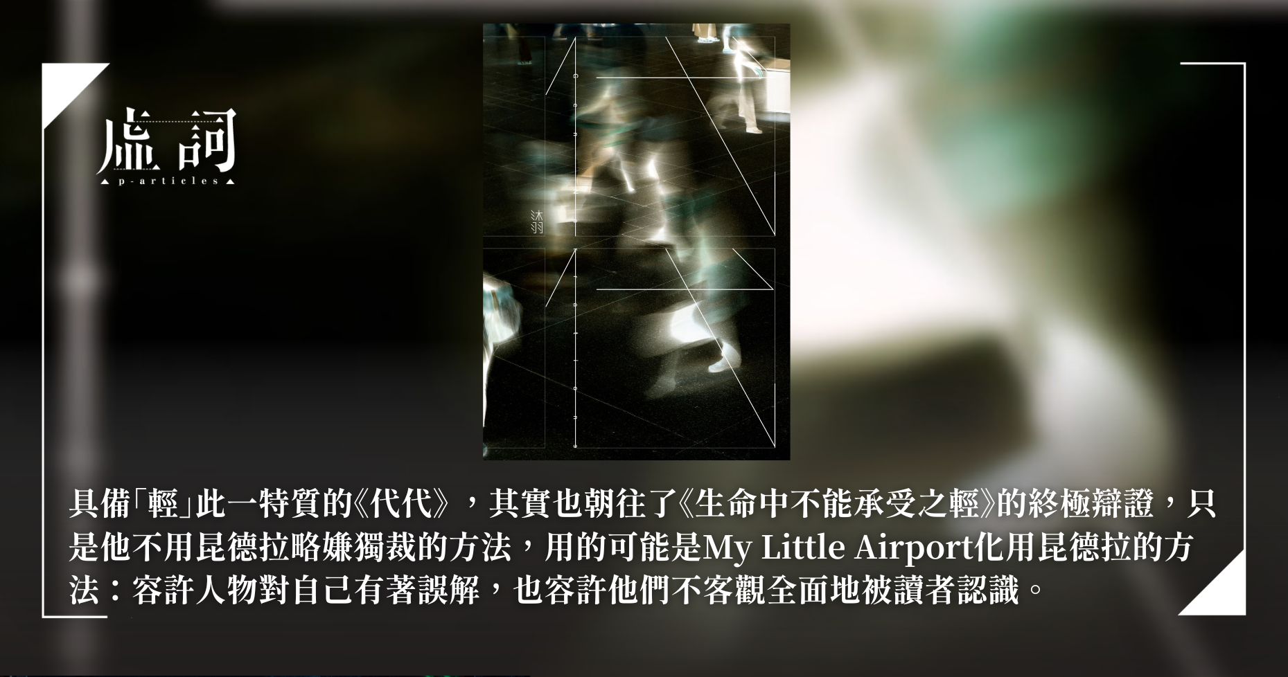 我曾經讀過沐羽寫米蘭.昆德拉的文章,從中看出他的質疑與保留,多於影響或啟悟,並私自覺得這是很理解,或很能同理昆德拉的人,會有的複雜情緒。不過《代代》對米蘭.昆德拉的引用,則沒有這般情感複雜,故事中他只是一個書寫流亡議題的前輩,幾乎每個主角都可以引用他,隨便談論但不涉評價,包括他小說的情節,也包括他不在原鄉又書寫捷克的道德難題。《代代》中更常被提及其實是My Little Airport的〈milan〉:「你告訴我一個昆德拉的故事/關於一對情侶/假裝陌生男女/再勾引對方去酒店裡一起睡/最終勾引到分不到/對方和自己本身是誰」。