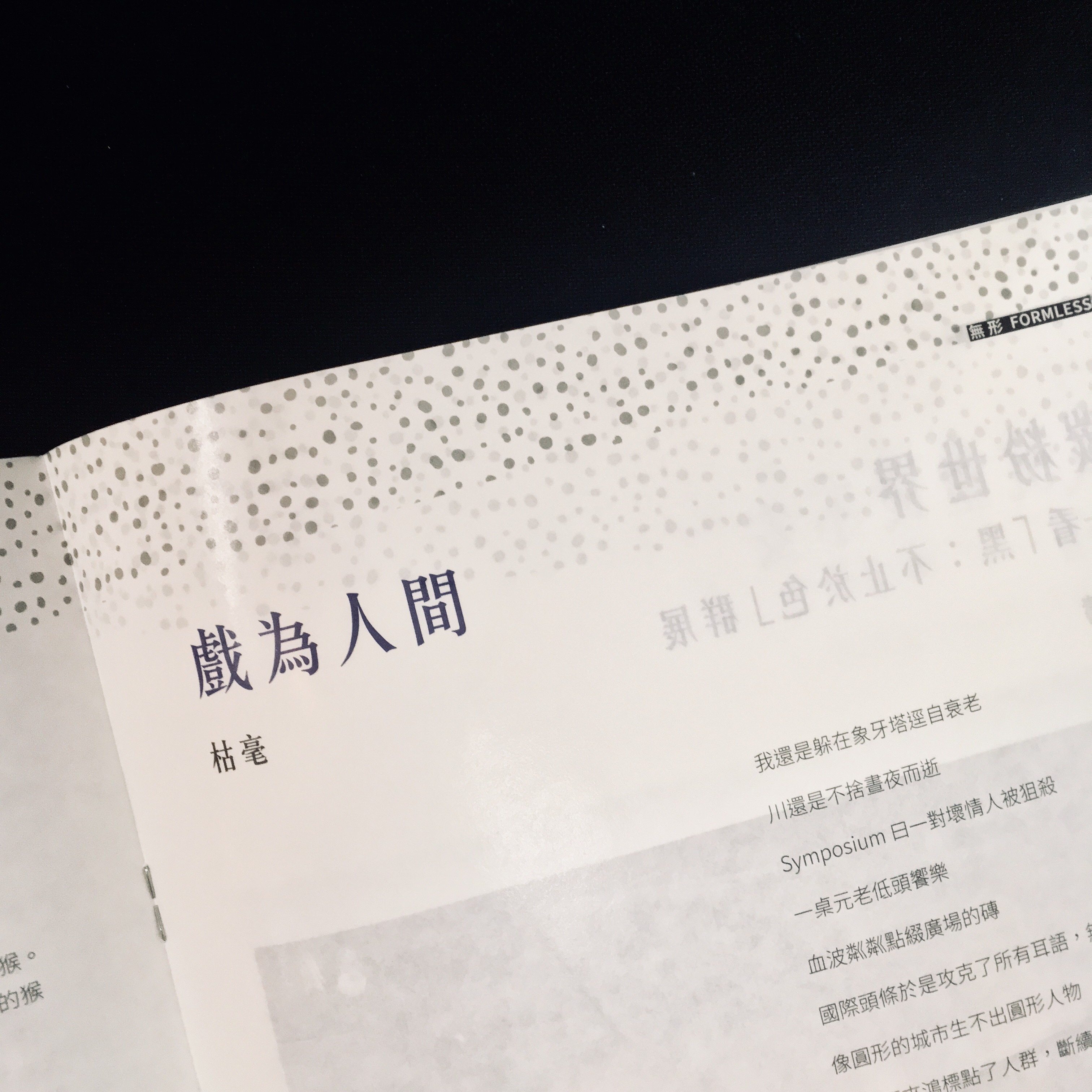 這一期《無形》的訪問皆具份量,談到時代的話題——陳智德與許寶強。兩位都是實話實說、實事求是的人,前者以一己的書寫與歷史「招魂」回應時代,後者則設立了流動共學課室,以織網的決心和耐性,挑戰權力與制度,兩者各以自己的方式關心社會、介入社會,實在值得一讀。