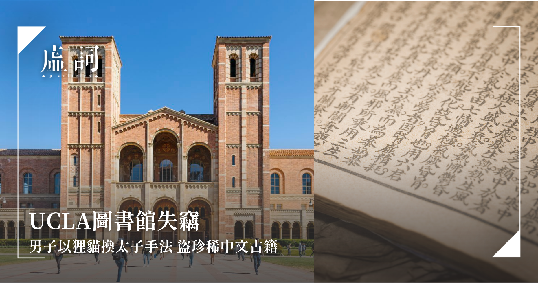美國司法部於8月7日表示,一名38歲男子Jeffrey Ying被指控從加州大學洛杉磯分校(UCLA)圖書館系統竊取價值約21.6萬美元(約170萬港元)的稀有中文古籍。Ying使用多個化名,包括Alan Fujimori、Austin Chen及Jason Wang,進行盜竊行為。這些古籍可追溯至13世紀,涵蓋南宋至元朝時期,每本價值介乎274美元至7萬美元不等。