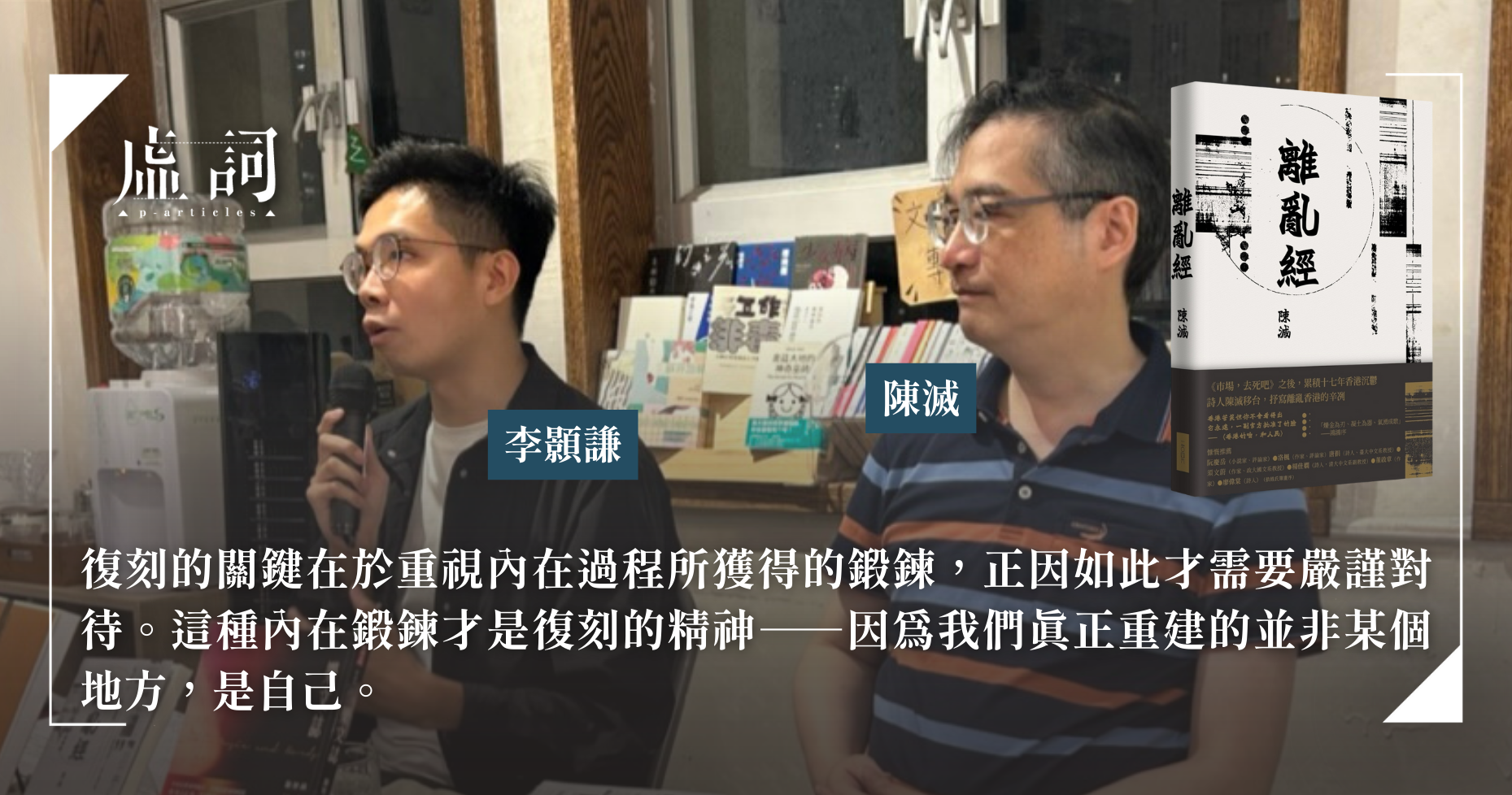 陳滅形容「復刻」的概念正是他企圖挽留消逝之物的方式,旨在重現過往香港值得珍視的部分,他將此過程喻為「招魂」。李顥謙回應道,有意識的復刻在於還原與重建,詩作會彰顯這種還原的價值。陳滅進一步延伸:復刻的重點不僅在於還原,若僅止於此,則易流於懷舊,層次不同。他認為復刻的關鍵在於重視內在過程所獲得的鍛鍊,正因如此才需要嚴謹對待。這種內在鍛鍊才是復刻的精神——因為我們真正重建的並非某個地方,是自己。