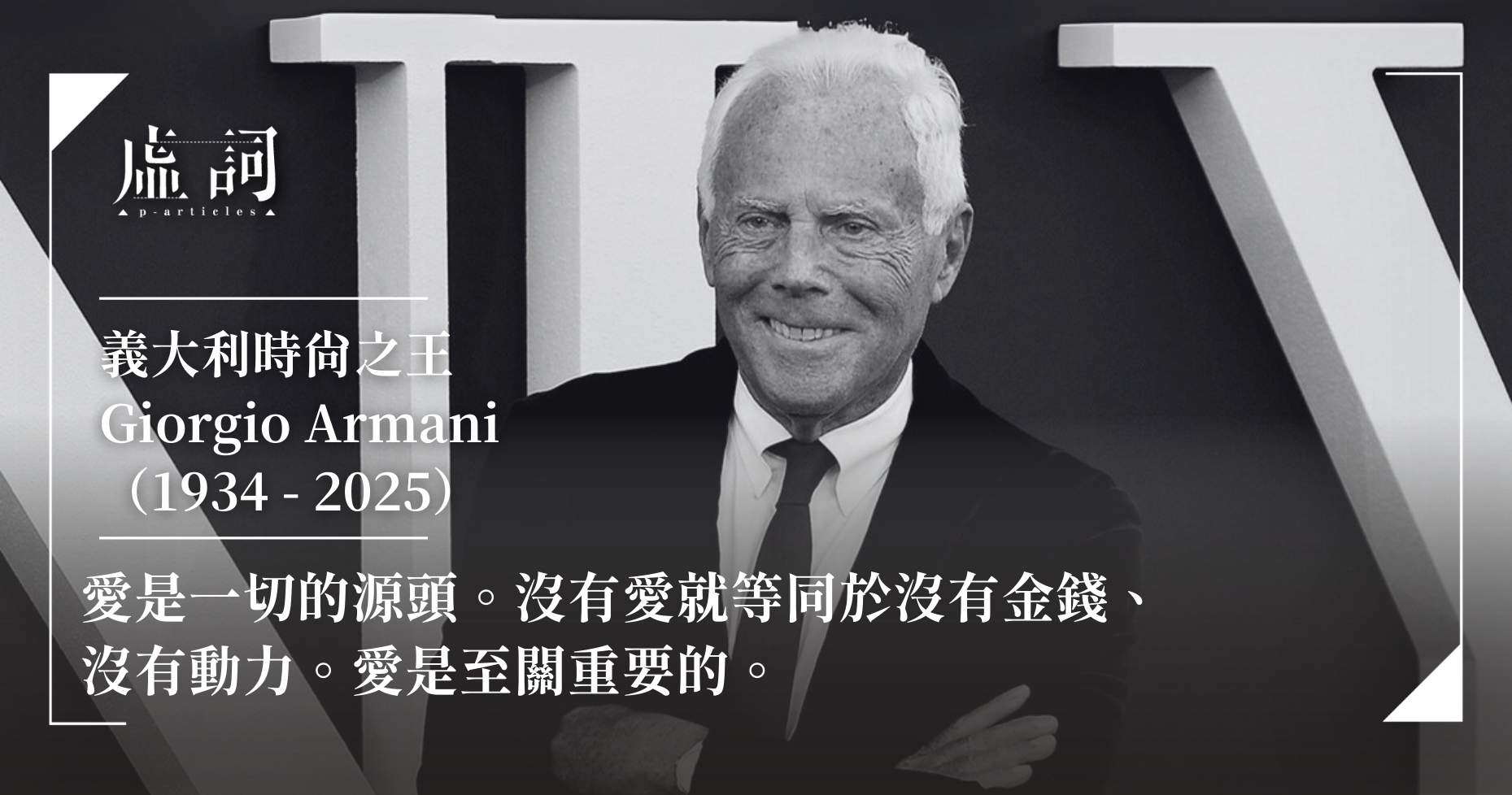 被譽為「時尚之王」(King of the Blazer)的義大利時裝設計師Giorgio Armani,享壽91歲。其公司於日前(4日)發表聲明表示Giorgio作為品牌創辦人,是靈魂人物,也是始終不懈的推動力量,「他一向被員工與合作夥伴尊敬且敬愛地稱為『Armani先生』(Il Signor Armani),於至親環繞下平靜離世。直到最後一刻,他始終不懈,將自己奉獻給公司、系列作品,以及眾多正在進行與未來的計畫。」