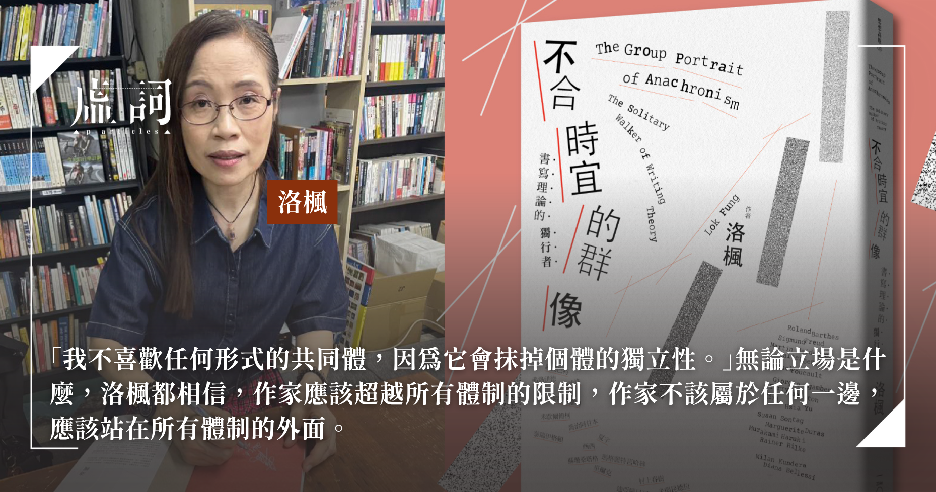 「我不喜歡任何形式的共同體,因為它會抹掉個體的獨立性。」無論立場是什麼,洛楓都相信,作家應該超越所有體制的限制,作家不該屬於任何一邊,應該站在所有體制的外面。