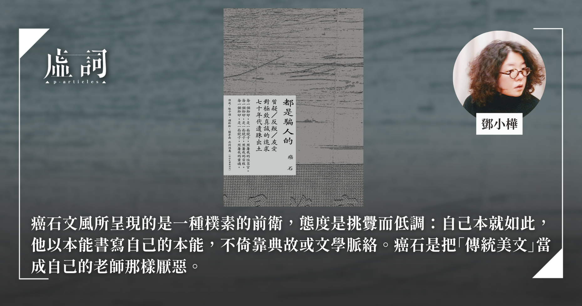癌石是七十年代出現的香港傳奇詩人,神龍見首不見尾,作品發表數量相當少。據知他在青年時代就移居外國、遂絕跡本土文壇數十年。近十年突又偶爾於文學雜誌上發表文章,以前的詩作被重新挖掘出土而受到論者大力推崇,更出人意表的是癌石甚至接受了媒體訪問、帶遊深水埗。今夕何夕,這樣無法捉摸的詩人終於要首度出版自己的作品集,自擬書名為「都是騙人的」。