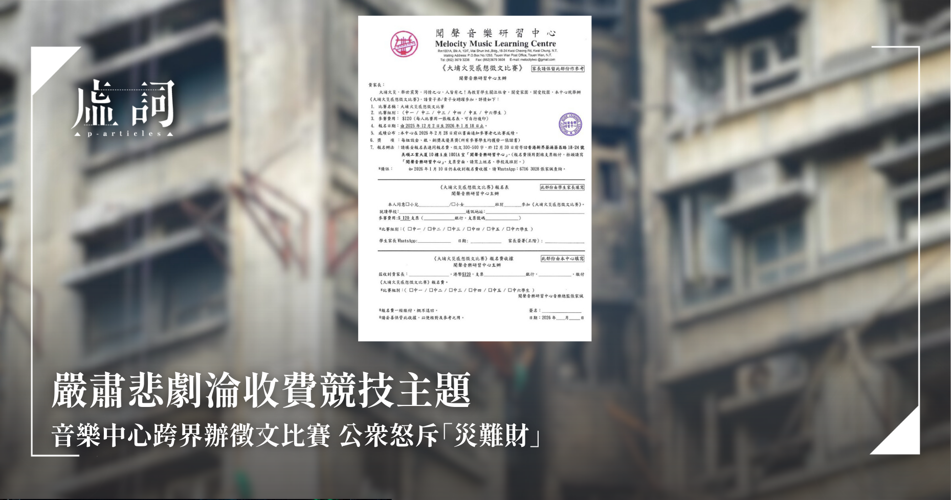 大埔宏福苑上星期發生釀成嚴重傷亡的五級大火,正當社會氣氛哀傷、各界專注於救援與善後工作之際,坊間一間名為「聞聲音樂研習中心」的機構,近日向全港中學發出《大埔火災感想徵文比賽》報名邀請,若學生意欲參加便需繳交120港元報名費,因而被輿論質疑其為費災難及藉機斂財之舉。