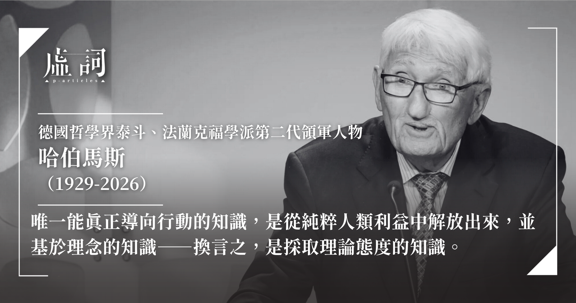 德國當代最具影響力的哲學家及社會學家尤爾根·哈伯馬斯(Jürgen Habermas)於3月14日在德國巴伐利亞州施塔恩貝格(Starnberg)與世長辭,享耆壽96歲。其生前長期合作的蘇爾坎普出版社(Suhrkamp Verlag)引述家屬說法,正式對外證實死訊。哈伯馬斯被譽為戰後德國最有影響力的思想家之一;作為法蘭克福學派第二代核心成員,他對批判理論的發展、《溝通行動理論》的建構,以及公共領域的探討,塑造當代歐洲哲學與社會理論的格局。