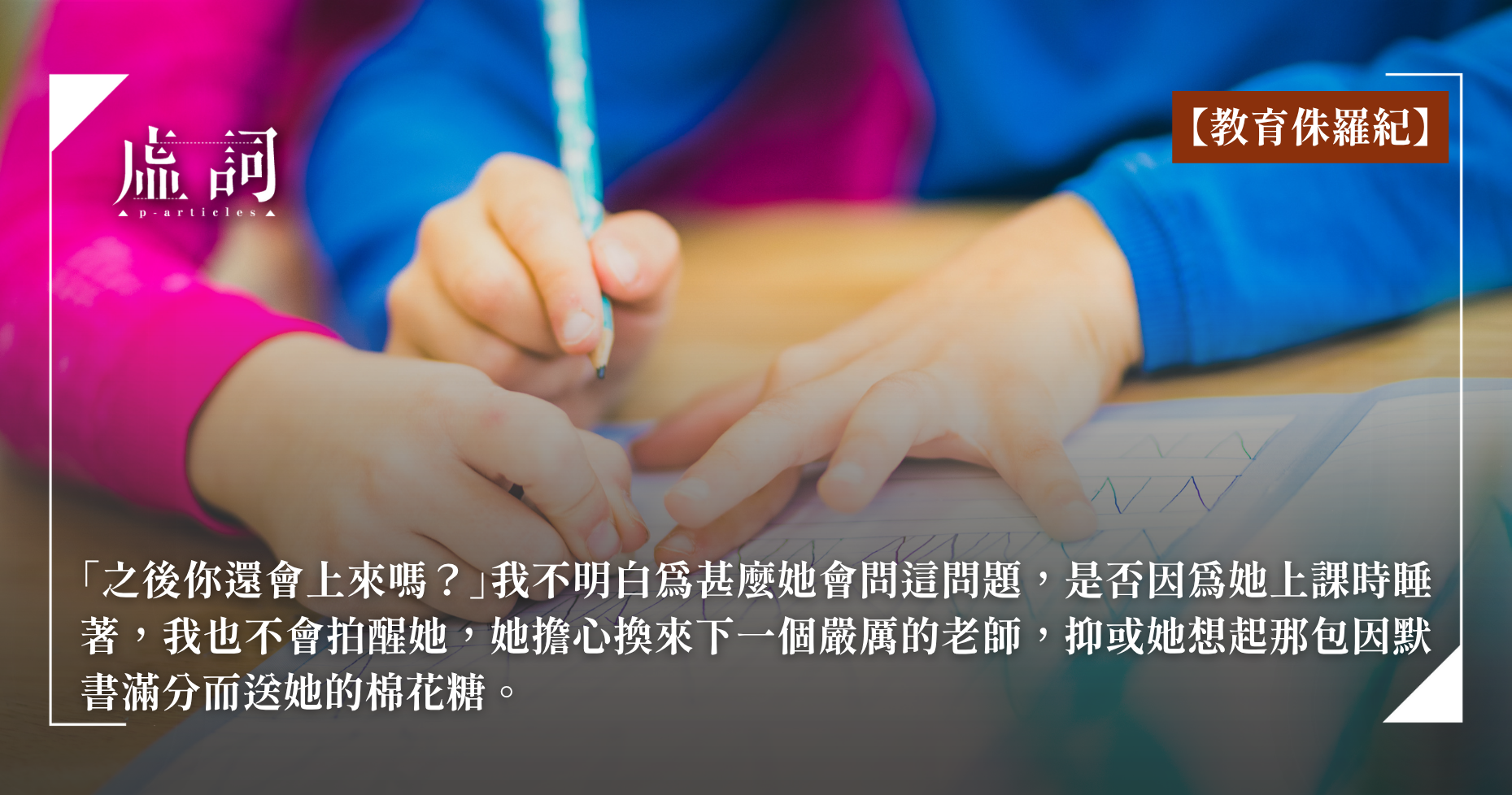 她問我相同的問題,「小翠,專心上課,時間會過得快點。」「完成這份作業,可以早五分鐘落堂。」她都沒聽得入耳。直到今堂我跟她說:「小翠,我有新工作,之後不能再幫你補習。」最後一堂課,她不再問何時落堂,她不停問我去哪裡,更問:「之後你還會上來嗎?」我不明白為甚麼她會問這問題,是否因為她上課時睡著,我也不會拍醒她,她擔心換來下一個嚴厲的老師,抑或她想起那包因默書滿分而送她的棉花糖。