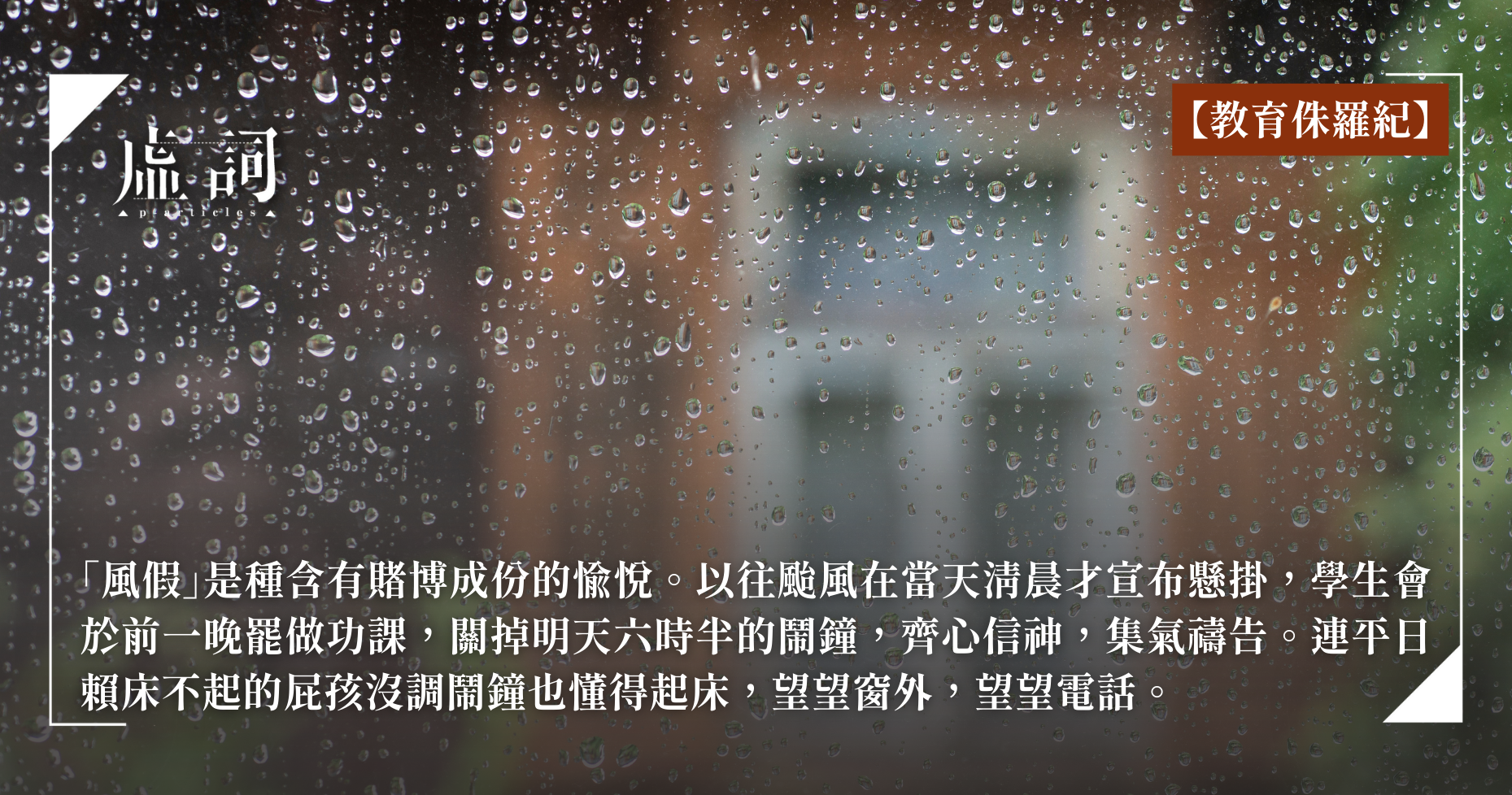 我一進門,補習學生無法抑制對後天懸掛颱風的期盼,不停向我分享不用上課與補課的喜悅。現在的颱風已頻密得天文台會提前宣布,大家能事先做好心理準備與應對措施。當天,他竟帶着燦笑在文言文小測拿到十九分,平常他最高也只能拿個六、七、八分。