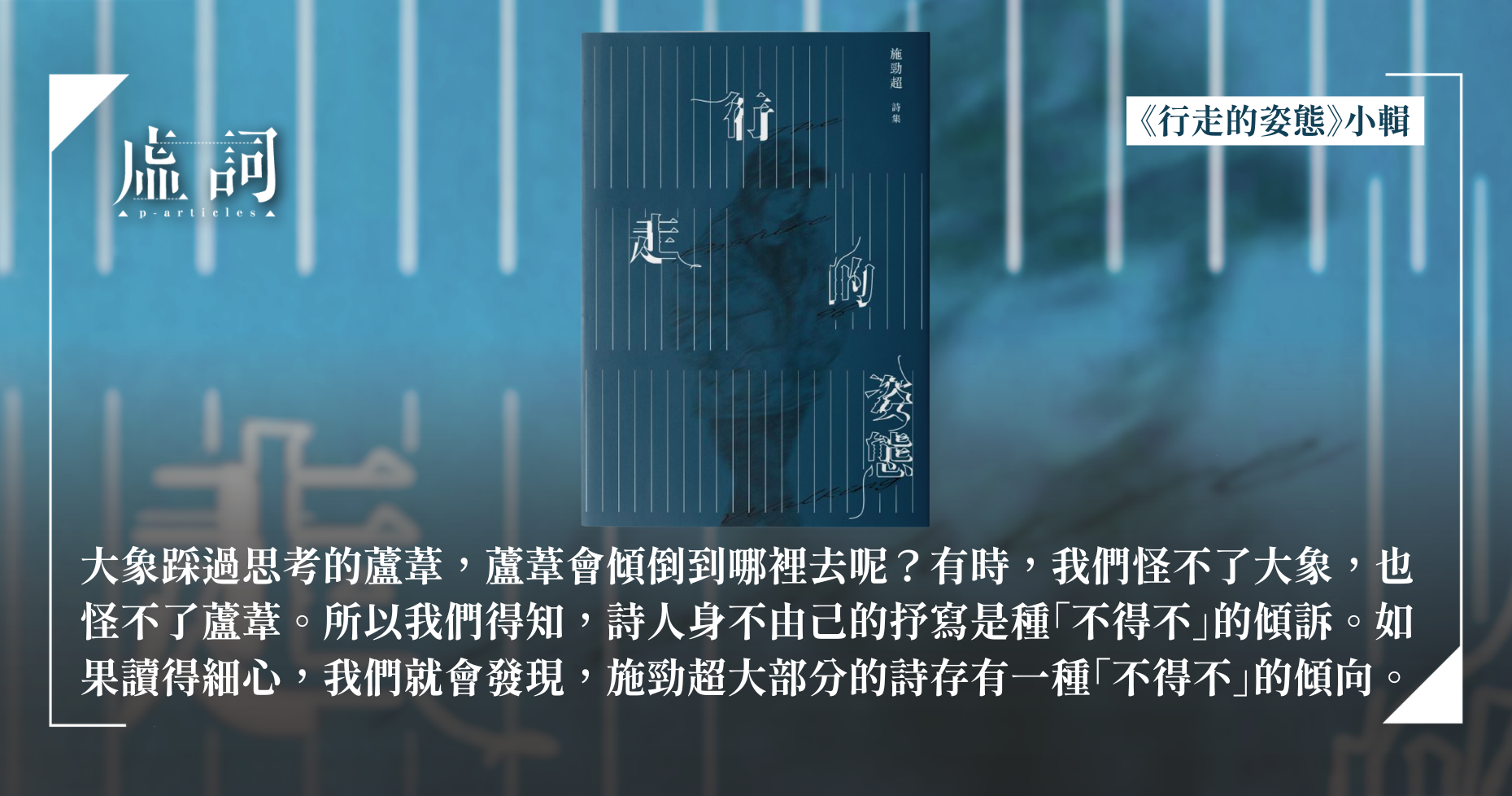 《行走的姿態》是香港詩人施勁超的首部詩集,於2023年出版。這部詩集以詩人作為觀察者和漫遊者的視角,書寫對城市的感悟。全書分為五輯,呈現「由外到內」的抒發軌跡,涵蓋不同的主題與風格,反映了施勁超在行走中的多樣姿態。虛詞編輯部為此組成小輯,收錄三篇文章:包括筆訪施勁超分享詩創作的緣起、個人詩觀、香港詩的發展;盧麗斯以本雅明提出的漫遊者及米歇爾‧德‧賽托從解構主義提出的步行者陳述分析作為切入點,分析詩人在凝視外界、自己的同時,表達出對資本的反抗以及於生命的思考;許頤蘅指出施勁超如何在眾多「不可說」中,以搖晃卻堅定的步伐跨越,無懼跌落,展現其詩歌中的力量與決心。