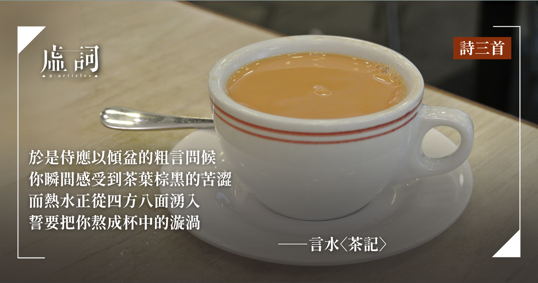 讀詩三首。言水傳來〈茶記〉,以香港地道文化的茶餐廳隱喻人類在殖民、壓迫與存在危機下的掙扎;王兆基的〈退步書:致艾連·葉卡與吉克·葉卡〉借動漫《進擊的巨人》的葉卡兩兄弟,及劇中的軍事進步為意象,述說戰爭荒謔如何使世界退步;劉梓煬〈去死吧,市場貓〉詩作名致敬香港詩人陳滅的《市場,去死吧》,以貓諷刺消費文化的虛偽。