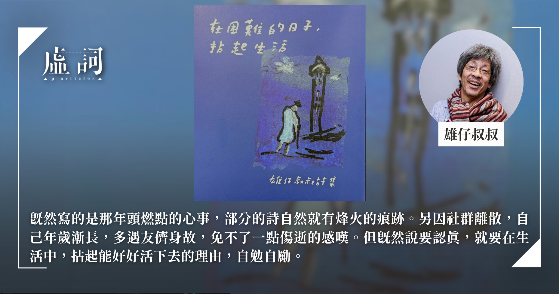 雄仔叔叔今年7月出版個人詩集《在困難的日子,拈起生活》,他在自序中表示集內詩作是自自2019年後,決心「認認真真」寫詩的成果。詩作觸及時代烽火、社群離散與傷逝感嘆。詩集共分「哀傷的窪穴」、「歲月催促•斯人流散」、「點都好,親近地活著」三輯,同時收錄作者38幅塗鴉,既安撫情緒,亦是想像的實踐。虛詞編輯部將分享集內的三首詩作〈有些日子不得露面〉、〈發現自己〉、〈記住個世界〉以饗讀者,讓大家感受雄仔叔叔如何以詩代語,疏理洶湧與靜待的心情。