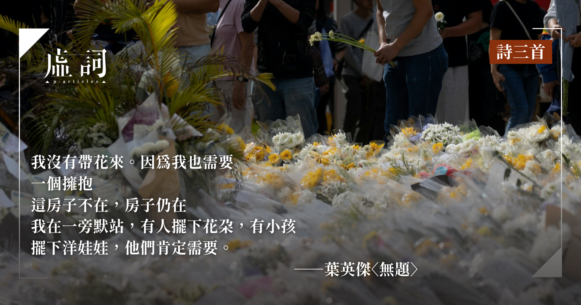 詩人葉英傑,乃是大埔大火災民之一,傳來詩作三首,抒寫大埔災前災後對比。〈齊家〉寫於災前,是詩人一貫平淡恬靜詩風,當時豈知家破在即;〈無題〉成詩於災後,鉅變已成,那詩中的抽離與創傷反而是外界不能想像的真實;〈無題·二〉記敘災後七日後重返火場收拾,重複說的「仍在」是多麼弔詭的詞,那平靜又是何等驚異。盼讀者細味,透過詩與受災的人們同在。
