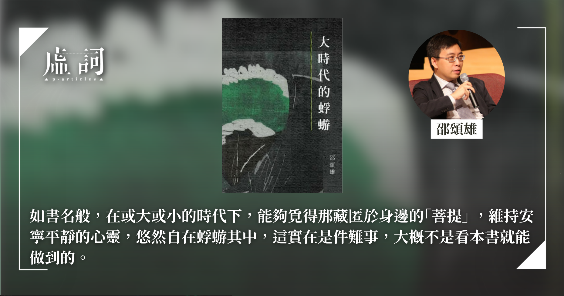 亞C偶然間覓得邵頌雄先生的《大時代的蜉蝣》,指出《大》的可貴之處在於「收錄的文章不少都是出於已經消失的媒體,曾存在於網絡上的」,而書中不少文章都書寫著過去,為此書添上一層色彩。作者邵頒雄先生是專研佛學的名家,亞C細數了一些書中曾提及過的佛理,並形容作者善於將哲思與「禪意」收於不少看似生活瑣事的記錄書寫裏;讀者能在他不同類型的文章中讀到別具匠心的意境,繼而引發思考有所領悟,或許能覓得那藏匿於身邊的半點「菩提」。