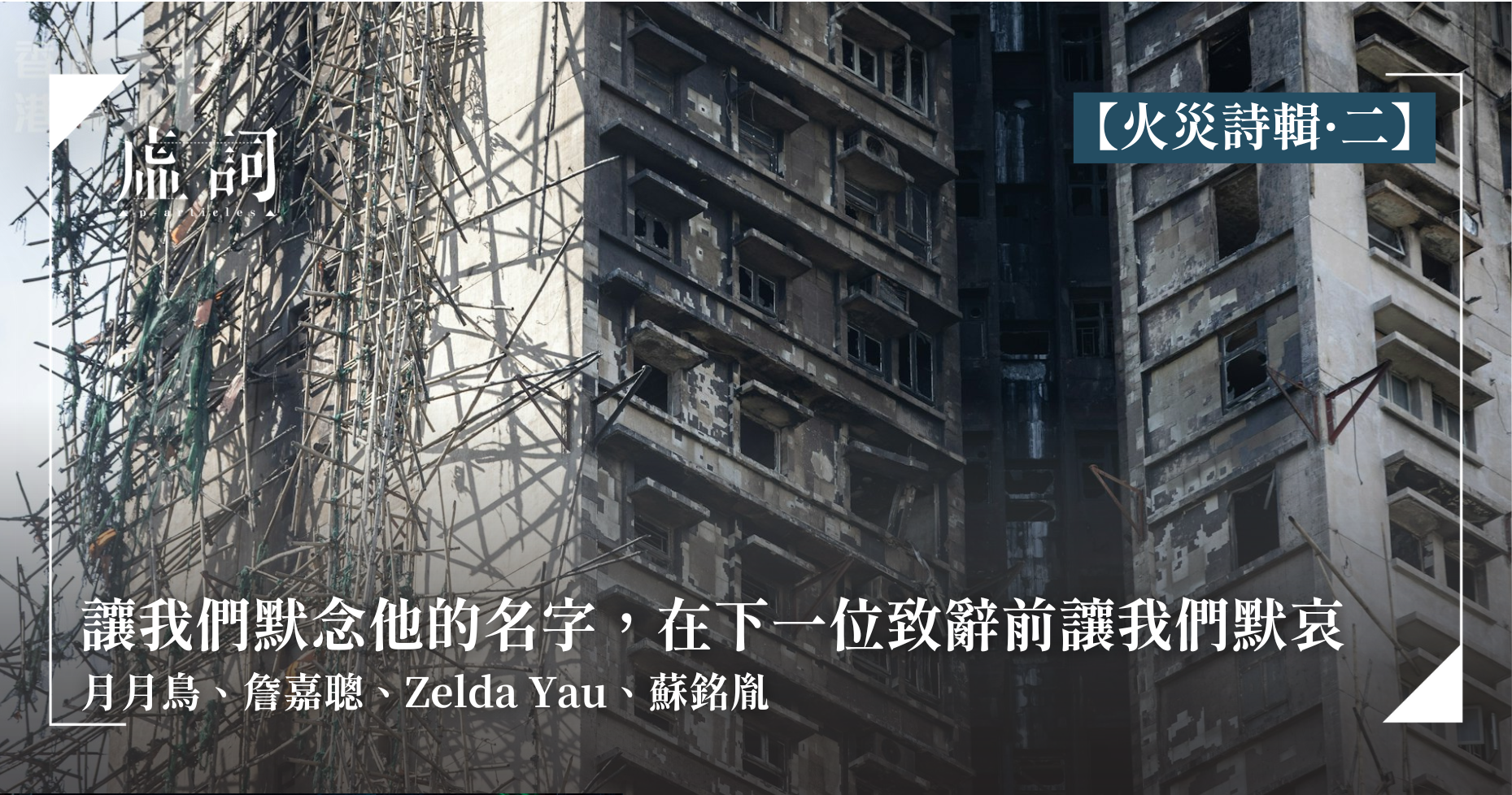 對大埔宏福苑發生火災,月月鳥、詹嘉聰、Zelda Yau、蘇銘胤寫詩感懷。當目睹那抹血紅要掙脫枷鎖,吞噬天地,一切阻礙化為灰燼的嘆息。存在的地基坍塌,在殘骸之下留下不可追溯的回聲。