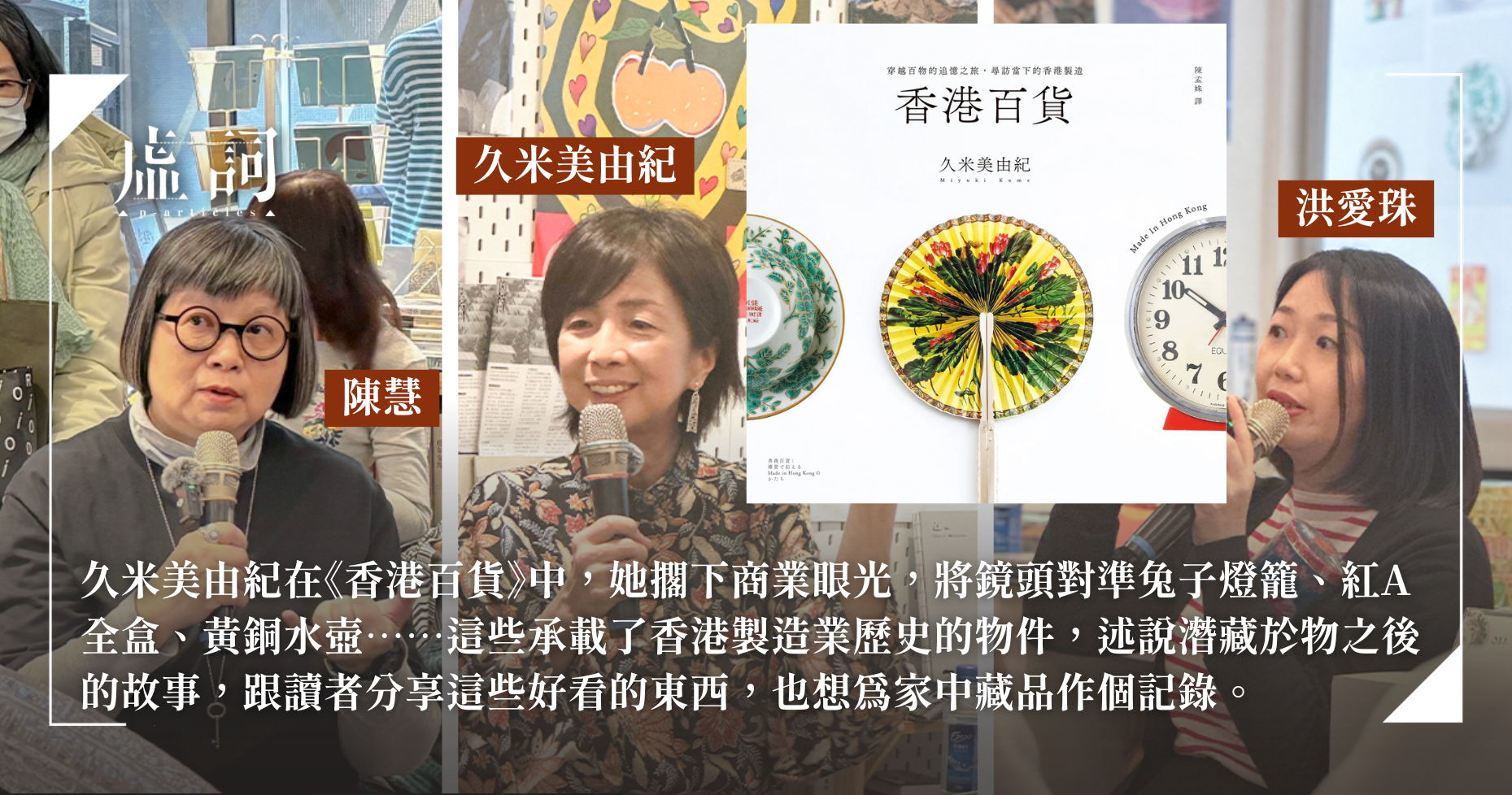 「香港製造」曾經在東亞、乃至東南亞紅極一時,但隨著香港產業轉型的改變,漸漸淡出大眾視線。積木文化今年年初出版了《香港百貨:穿越百物的追憶之旅,尋訪當下的香港製造》,作者久米美由紀在香港生活三十年,深深著迷於這些物件。早前她受邀來台,與台灣作家洪愛珠、香港居台小說家陳慧,一同分享有關香港製造的記憶和發想,回顧「Made in Hong Kong」獨有魅力。