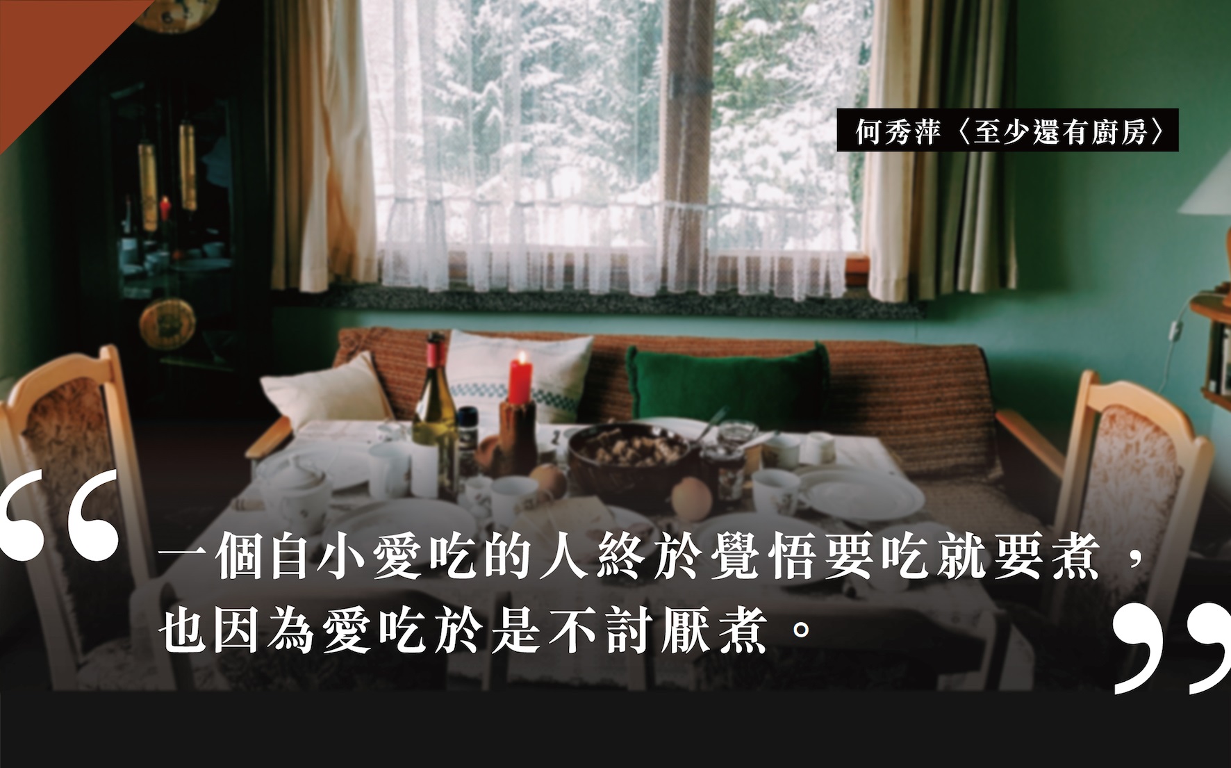 然而最想不到的是這些年來我竟跟「廚房」這名詞這空間發生著不同的關係。後八十年代,「廚房」只是我閲讀的一本日本流行小説的名字和題旨,那年頭與父母同住我甚少踏足廚房,頂多進去拿東西吃,切肉點火做菜從來不納入我日常活動之中。十年過去,命途帶領要在舊金山住下,佈置一個二人之家的廚房,毫無頭緒,只隨直覺,到大型家用品店選購廚具,東摸西試玩了半天,樣樣想買,結果有些鍋具還是從親戚廚房移徙過來。
