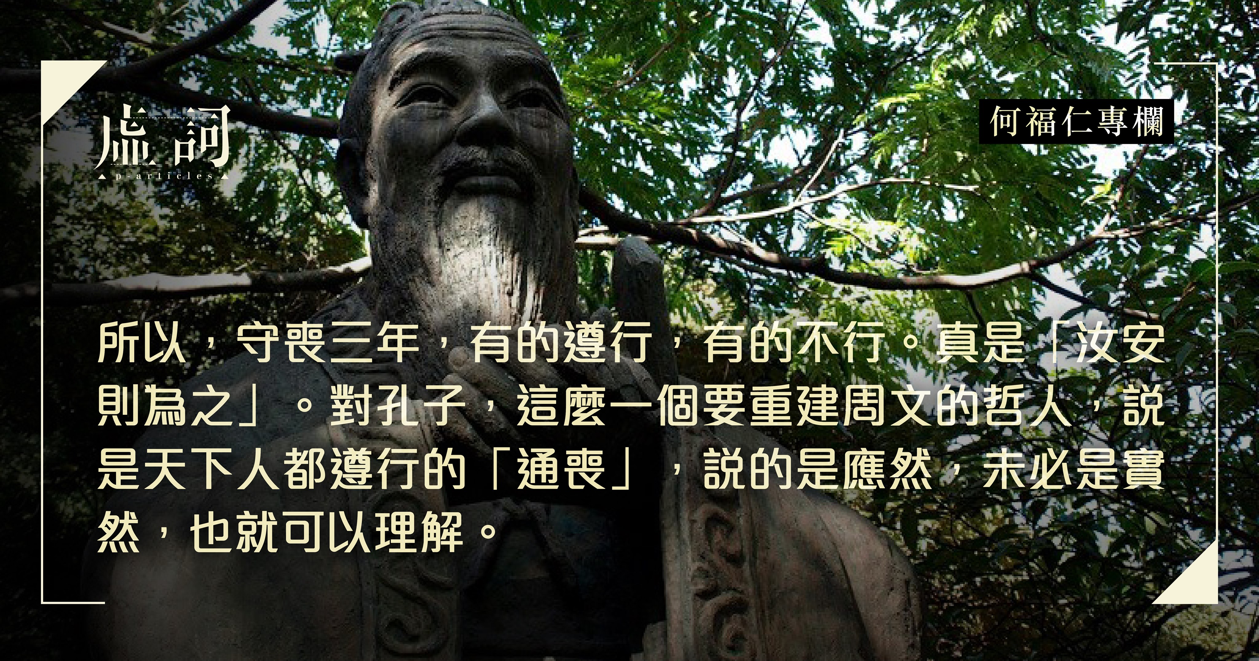 守喪三年,孔子說是要相對地報答父母褓姆我們三年之恩;這是籠統的說法,是否「虛名」,還需斟酌。荀子引《禮記》說這是「稱情而立文」(〈禮論〉),意思是:建立制度,要稱合人情;喪服按照生者與死者的感情深淺、關係親疏來決定。另一面,這種相稱,其實也是節制,「不及」固然不好,「太過」也不恰當。既無孝心,即無需再爭論守孝多久,那倒不如從古禮,守三年之喪,這是「天下之通喪」。康有為以為三年之喪是孔子的「發明」,是「改制所加隆」(《〈論語〉注》) ,這自是以經學干政的「六經注我」。孔子這樣說,可以不同意,卻不是沒有根據的創制。