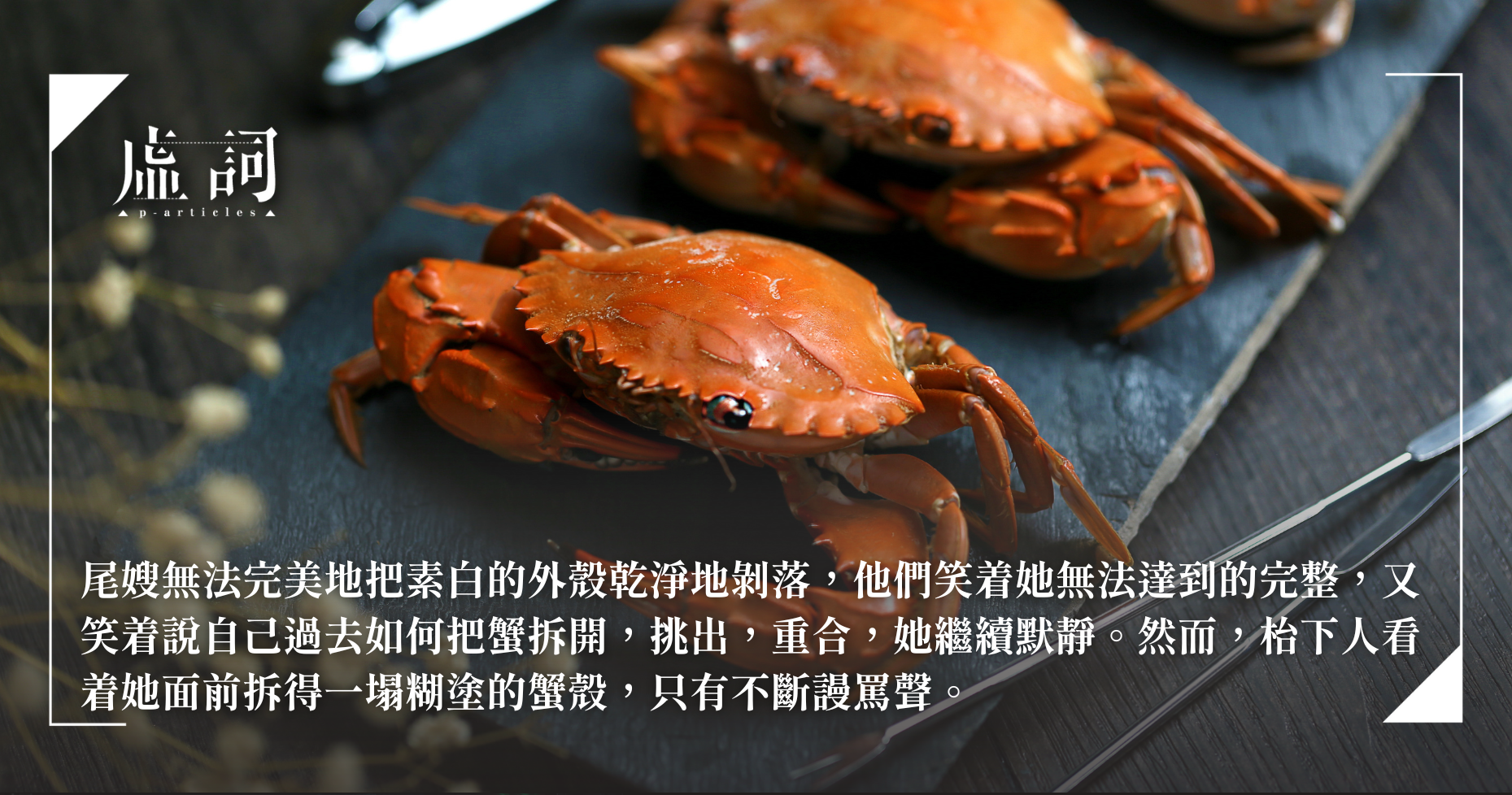 那場宴會又要開始了,她抱着小兒子,拖着大女兒,她已經可以預料所有的對話,「蟹⋯⋯」、「孩⋯⋯」,會心的微笑,飲醉酒的大笑,低啞的女聲與男聲重疊,拆蟹、食蟹,收拾殘骸,她在食與不食之間掙扎,在沉默的僵持中最後又會把肉塊吞下口,又是一場完美的宴會,所有貴賓都盡興,只有台上的她筋疲力盡。宴會中,她會提醒自己,因為愛是永不止息的,所以要忍耐,要讓他們說的話成真理,凡事包容,凡事相信,凡事盼望,凡事忍耐。