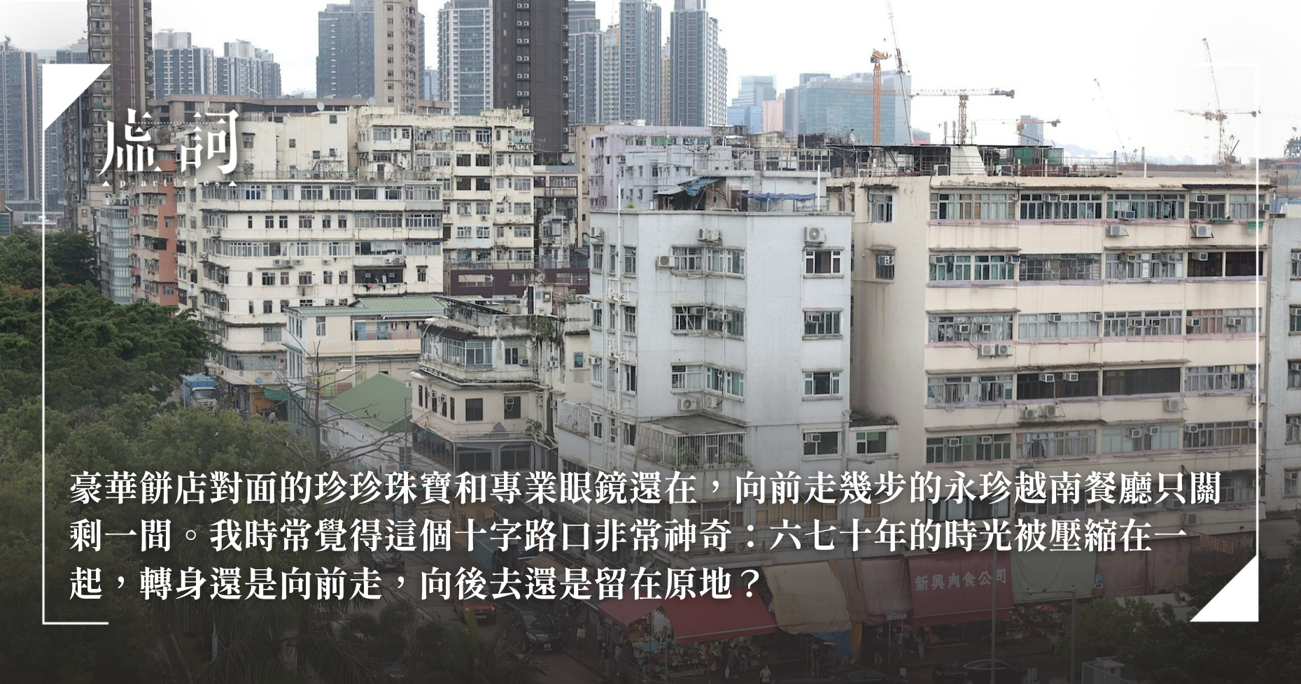 這次搞了很多年還是差不樣子,十多年後德昌魚蛋粉對面的公和荳品關門了(但棺材鋪和達記雞鴨還在)(是殺雞和送殯都是有關死亡的產業,所以放一起的概念嗎?)出口店沒了,有幾幢樓拆了。走到衙前圍道覺得熱便到國際百貨嘆冷氣(星屋內時間永遠停留在旅客抵達啟德機場的一刻)(寫上「我愛香港」的維港圖像紀念品、水晶花瓶、英式餐具、絲質睡衣、床上用品)(沒有買賣,只有冷氣在吹)。國際百貨旁邊的華南電影工作者聯合會和惠康還在,轉彎的豪華餅店就沒有了。豪華對面的珍珍珠寶和專業眼鏡還在,向前走幾步的永珍越南餐廳只關剩一間。我時常覺得這個十字路口非常神奇:六七十年的時光被壓縮在一起,轉身還是向前走,向後去還是留在原地?