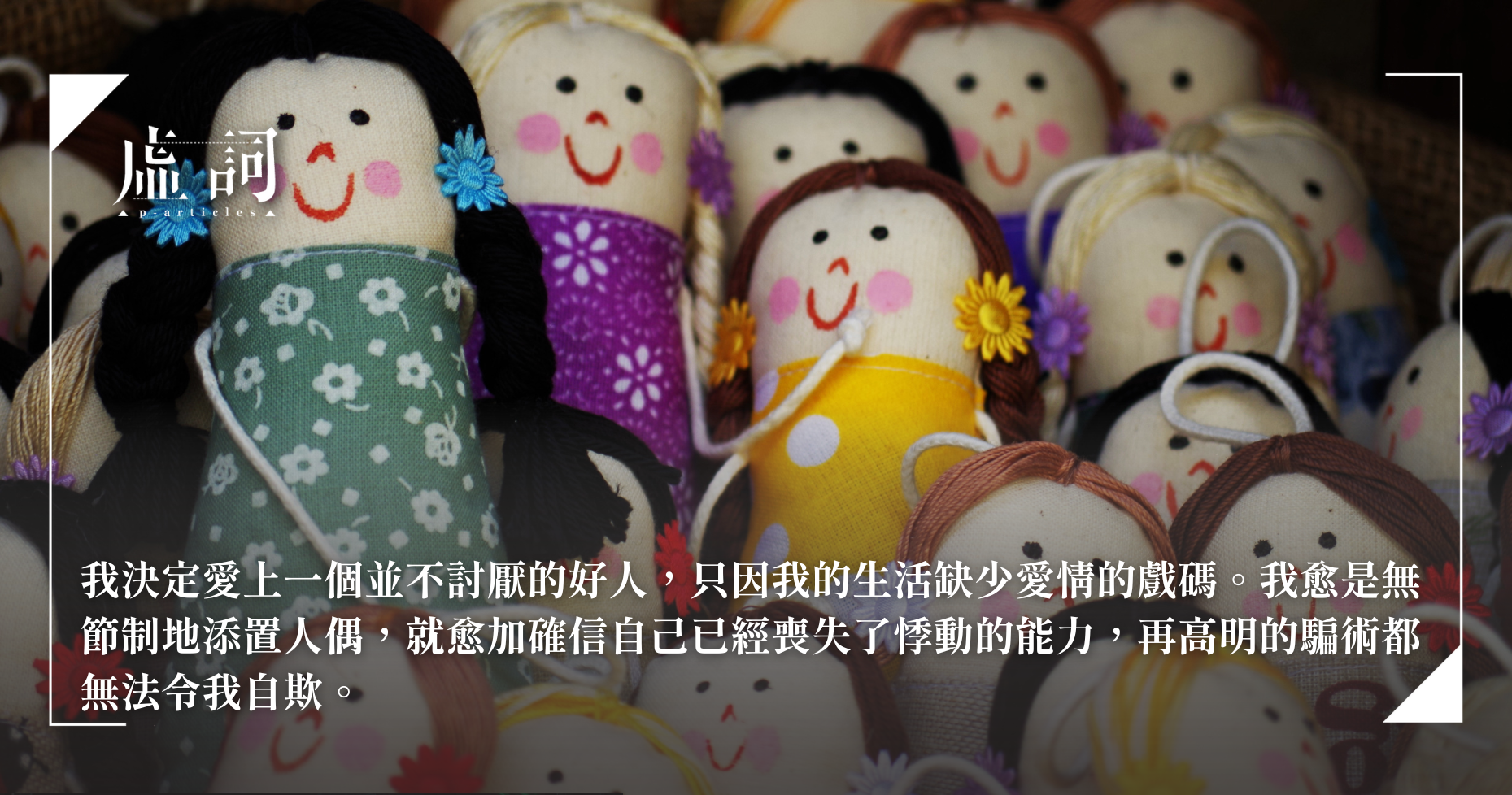 我平時用慣了灰色的眉筆,但最近開始用一隻絳紫色的蠟,把眉毛畫成葡萄皮的顏色。我的頭髮已經留得很長,我每天都用捲髮棒一節節把發尾卷出細小的弧度。我決定愛上一個並不討厭的好人,只因我的生活缺少愛情的戲碼。我愈是無節制地添置人偶,就愈加確信自己已經喪失了悸動的能力,再高明的騙術都無法令我自欺。