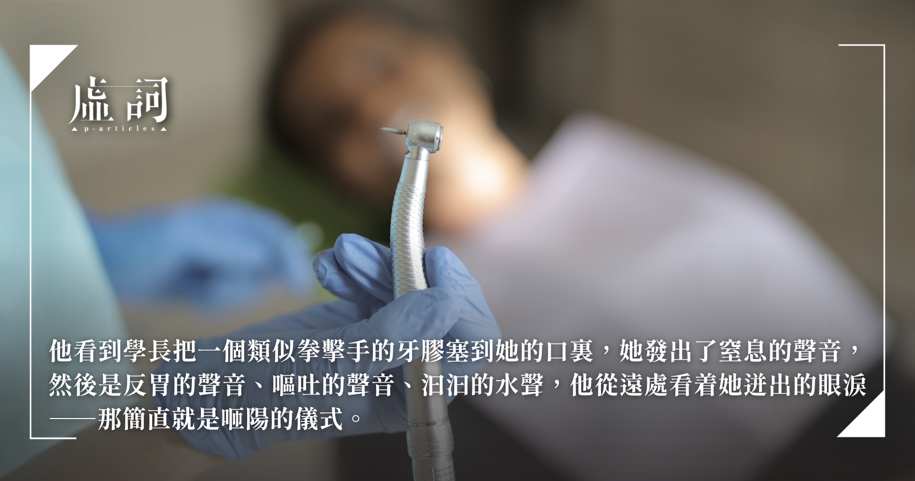 大約一個月後,她回來洗牙,那天學長回鄉慶祝排燈節,那是為了慶祝人們取回燈光的重大節日。而她依然坐在那個椅子上,注視着那個酷似皮克斯電影裏機械人的眼睛,然後是威廉的眼睛,威廉無法打開話匣子,除了水聲,還是水聲,於是——水聲,與水聲——啞口無言,他隔着口罩,依然嗅到那些腥紅的血水,處女血,與精液的俗臭,合而為一,水聲與吸啜聲,吸管不斷吸走證據與詞彙,牙石、血、污物與水聲,一一吸走。她過來看了看,說:「你有點蛀牙,不如趁今天把它補好?橫豎下個月才要下金屬箍。」