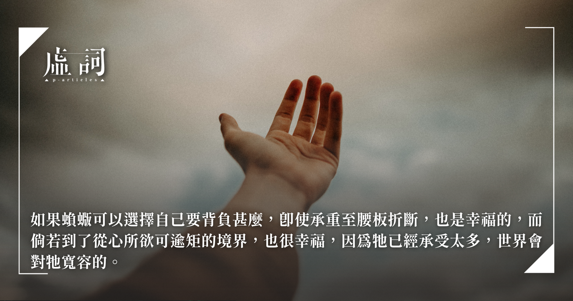 在回陽的天空下,蝜蝂接下來怎樣,我們都不知道,因為我們還要像玩俄羅斯方塊般顧好不斷砸往頭頂的奇形怪狀。或許,如果牠可以選擇自己要背負甚麼,即使承重至腰板折斷,也是幸福的,而倘若到了從心所欲可逾矩的境界,也很幸福,因為牠已經承受太多,世界會對牠寬容的。