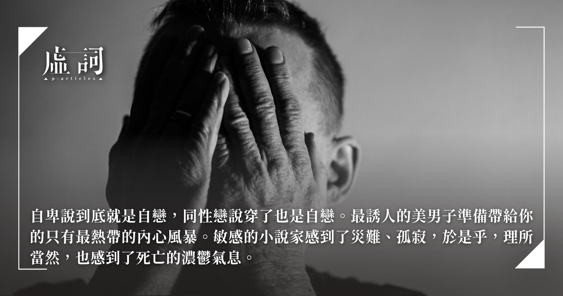 總之,自卑說到底就是自戀,同性戀說穿了也是自戀。最誘人的美男子準備帶給你的只有最熱帶的內心風暴。敏感的小說家感到了災難、孤寂,於是乎,理所當然,也感到了死亡的濃鬱氣息。但不。小說家之為小說家乃絕不輕言放棄。他迎接死亡的挑戰,誠如他闊步揚眉,準備迎接小眾暗黑品牌售貨員的挑戰。