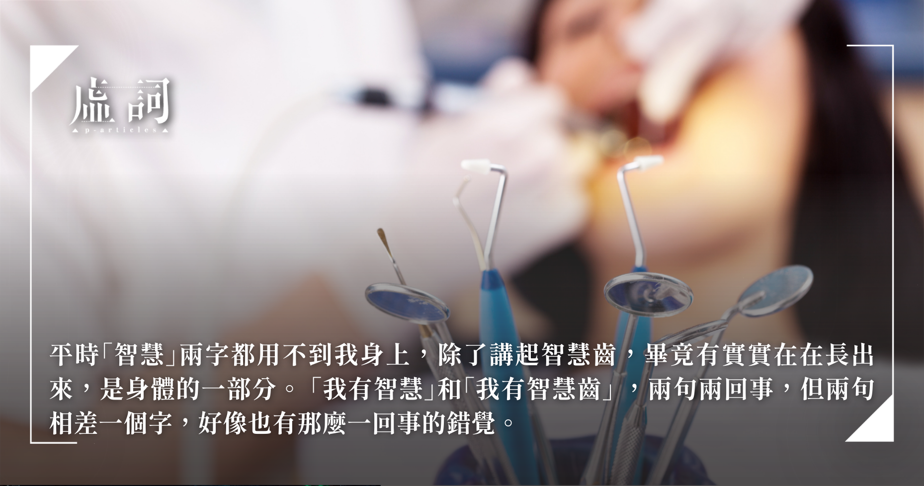 無財同時無才,無論是有「貝」還是無「貝」那個。我是沒有智慧的人,on9咁多年,智商堪虞,跟「智慧」兩字扯不上關係,唯一最貼近的,就是智慧齒。智慧齒和智慧,純粹兩個字相同,但也還好有兩個字相同。平時「智慧」兩字都用不到我身上,除了講起智慧齒,畢竟有實實在在長出來,是身體的一部分。「我有智慧」和「我有智慧齒」,兩句兩回事,但兩句相差一個字,好像也有那麼一回事的錯覺。稍為網搜,大概都說人類演化到今日,已無足夠空間容納智慧齒生長,名為智慧,實則廢物,屬於沒有用的牙齒,但我不也是沒有用的廢物?同類相親,同病相憐,我都還活著,智齒為什麼不能留著!的確,要是安安靜靜躺在那裡,沒有引起不適,我也傾向保留,除了因為實在懼怕手術,還多了份廢物情結。若情況許可,我很願意收留廢物,大家都不容易,何必。腐蛀就沒辦法了,該行刑就行刑,意義還是要讓路給現實,正如沒錢,是真的沒錢。