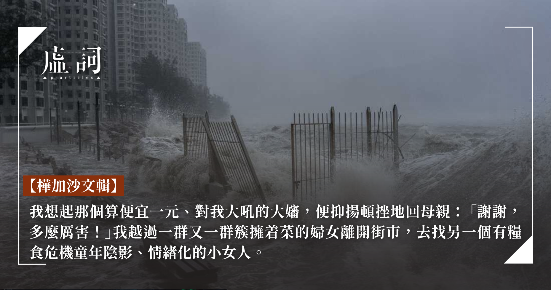 正想轉身繼續巡邏,母親來電,熱切地說:「我一大早已幫你買了茄子、油麥菜和生菜,我連嫂子的一份都買了,來我家吧!」我想起那個算便宜一元、對我大吼的大嬸,便抑揚頓挫地回母親:「謝謝,多麼厲害!」我越過一群又一群簇擁着菜的婦女離開街市,去找另一個有糧食危機童年陰影、情緒化的小女人。