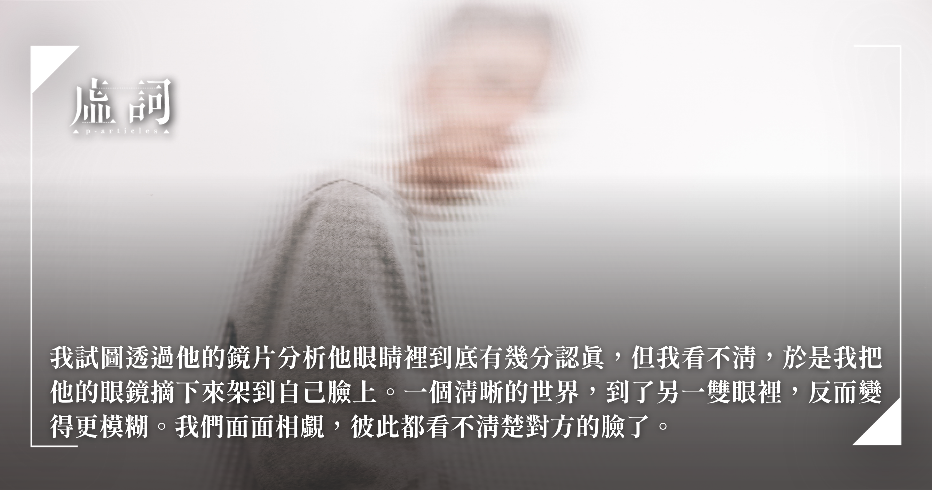 我試圖透過他的鏡片分析他眼睛裡到底有幾分認真,但我看不清,於是我把他的眼鏡摘下來架到自己臉上。一個清晰的世界,到了另一雙眼裡,反而變得更模糊。我們面面相覷,彼此都看不清楚對方的臉了。