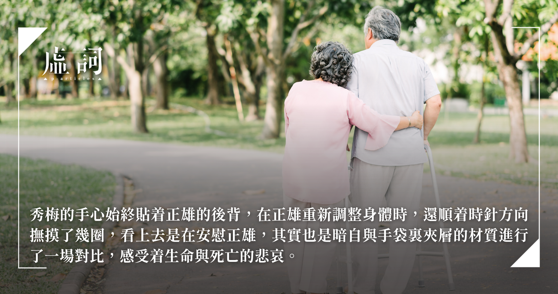 秀梅的手心始終貼着正雄的後背,在正雄重新調整身體時,還順着時針方向撫摸了幾圈,看上去是在安慰正雄,其實也是暗自與手袋裏夾層的材質進行了一場對比,感受着生命與死亡的悲哀。