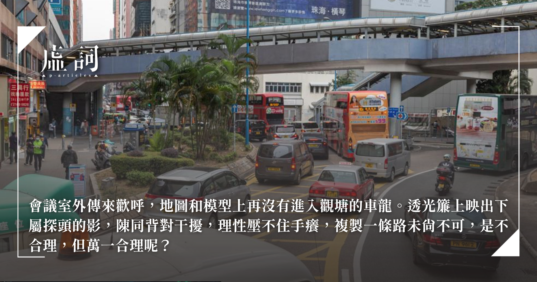 陳同皺著眉把平板貼近鼻頭,手指精準地落在觀塘道上車與車之間的狹窄空檔,再三查看藍色虛線框住的選取範圍,沒有車,沒有人,他才鬆下肩膀,又按複製,將全部巴士站改放二樓,地面舊路充當高速,不准停泊,外加一座接駁上下層的旋轉車道。