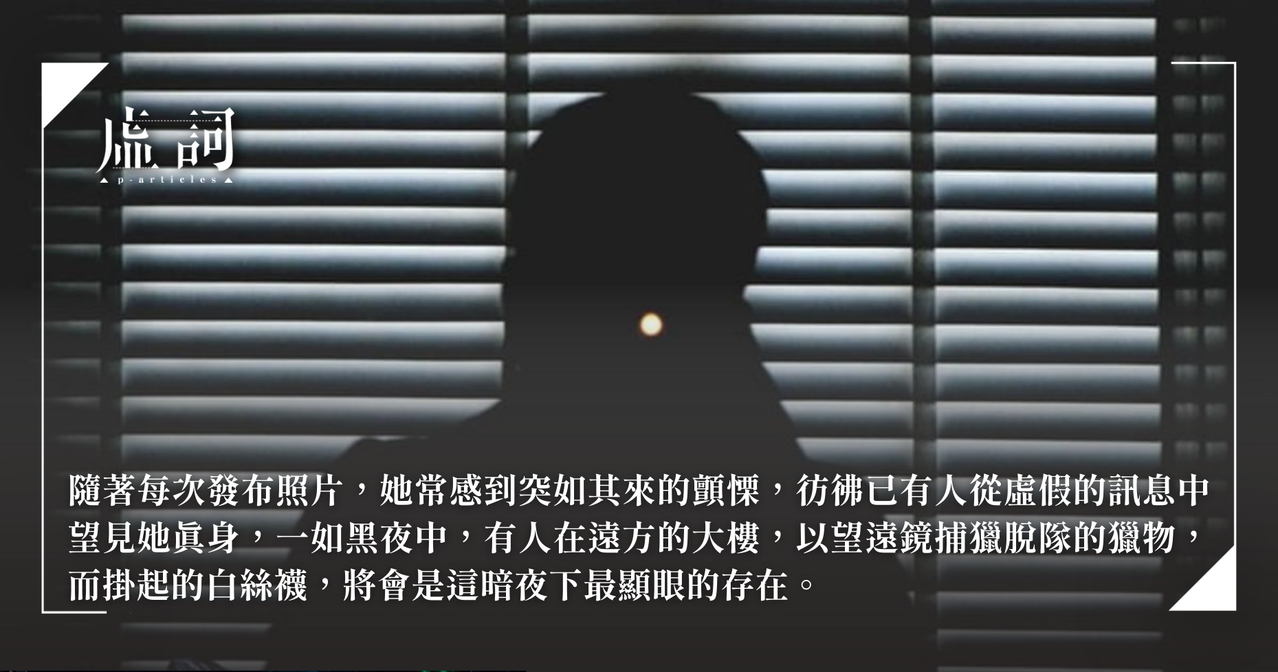 結束攝影,莉莉將清洗後的白絲襪掛出陽台。黑夜中,一切都顯得深邃幽暗,只有她的內衣與絲襪,在黑夜中尤為明顯。隨著每次發布照片,她常感到突如其來的顫慄,彷彿已有人從虛假的訊息中望見她真身,一如黑夜中,有人在遠方的大樓,以望遠鏡捕獵脫隊的獵物,而掛起的白絲襪,將會是這暗夜下最顯眼的存在。