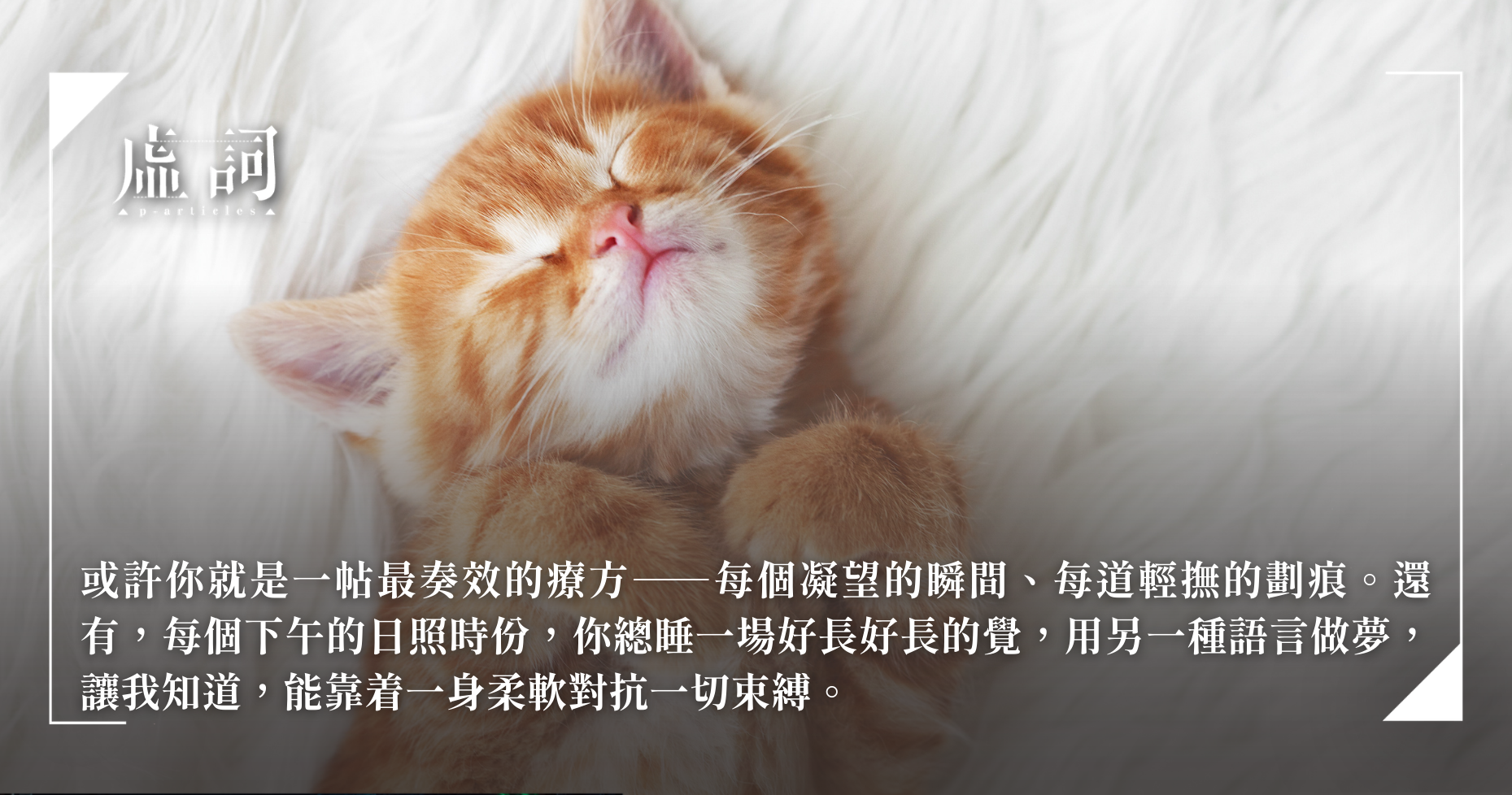 時日總比人心狡猾。我都知道,你會在不知不覺間長大成少年,然後,在我釐清生活的秩序之前,你會更快看透世界的運作,走到光的盡頭。或許你就是一帖最奏效的療方——每個凝望的瞬間、每道輕撫的劃痕。還有,每個下午的日照時份,你總睡一場好長好長的覺,用另一種語言做夢,讓我知道,能靠着一身柔軟對抗一切束縛。