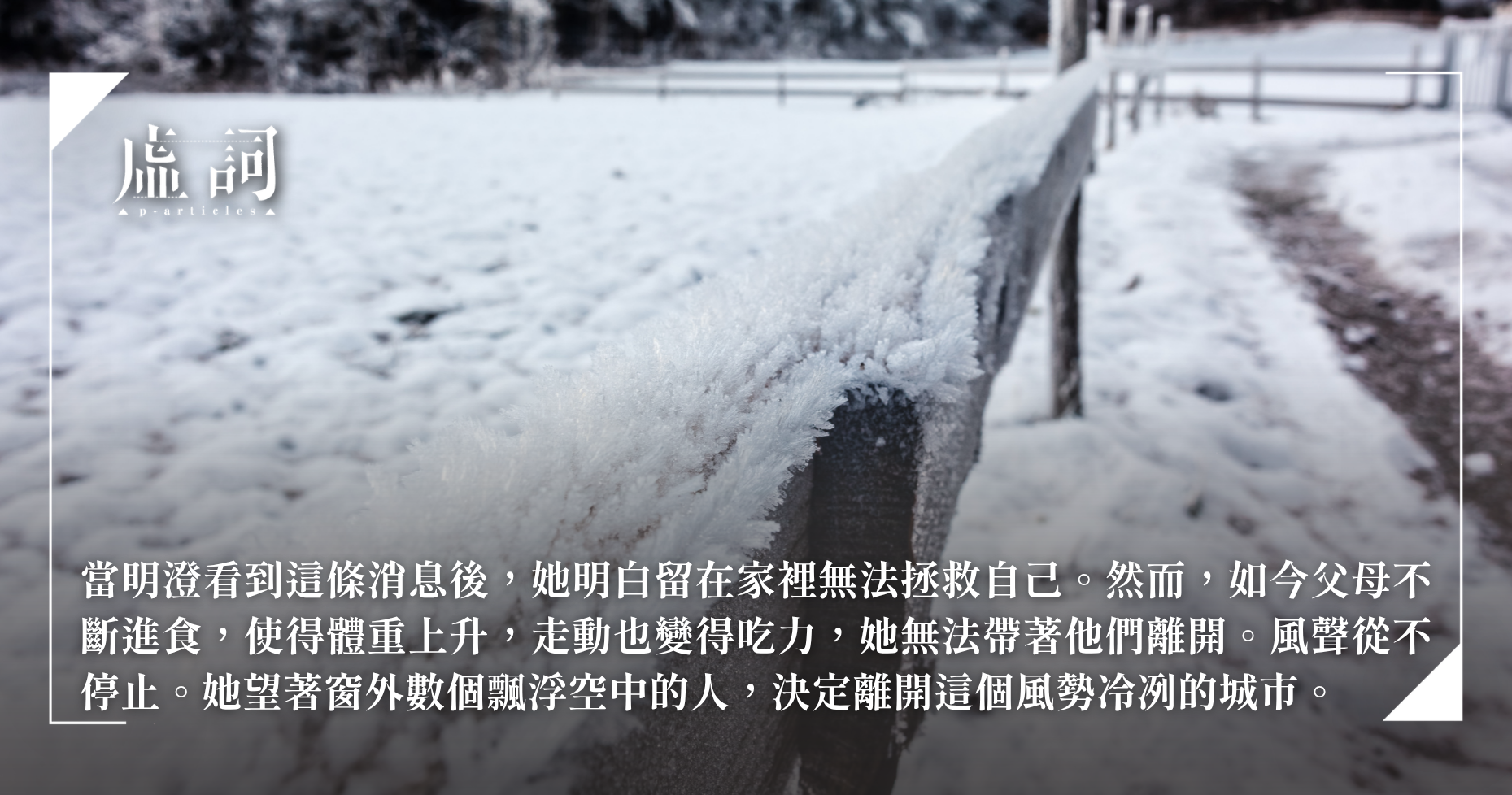 母親的身體早已佔據了整個客廳。明澄只能待在她的房間。但待在家裡的日子越長久,明澄的手腳隨溫度下降變得冰冷,皮膚失去彈性,思考亦漸漸減少。冷空氣入侵身體各處,她就越發感到麻木。她每天只會打開電視機,查看政府有否更新任何新消息。